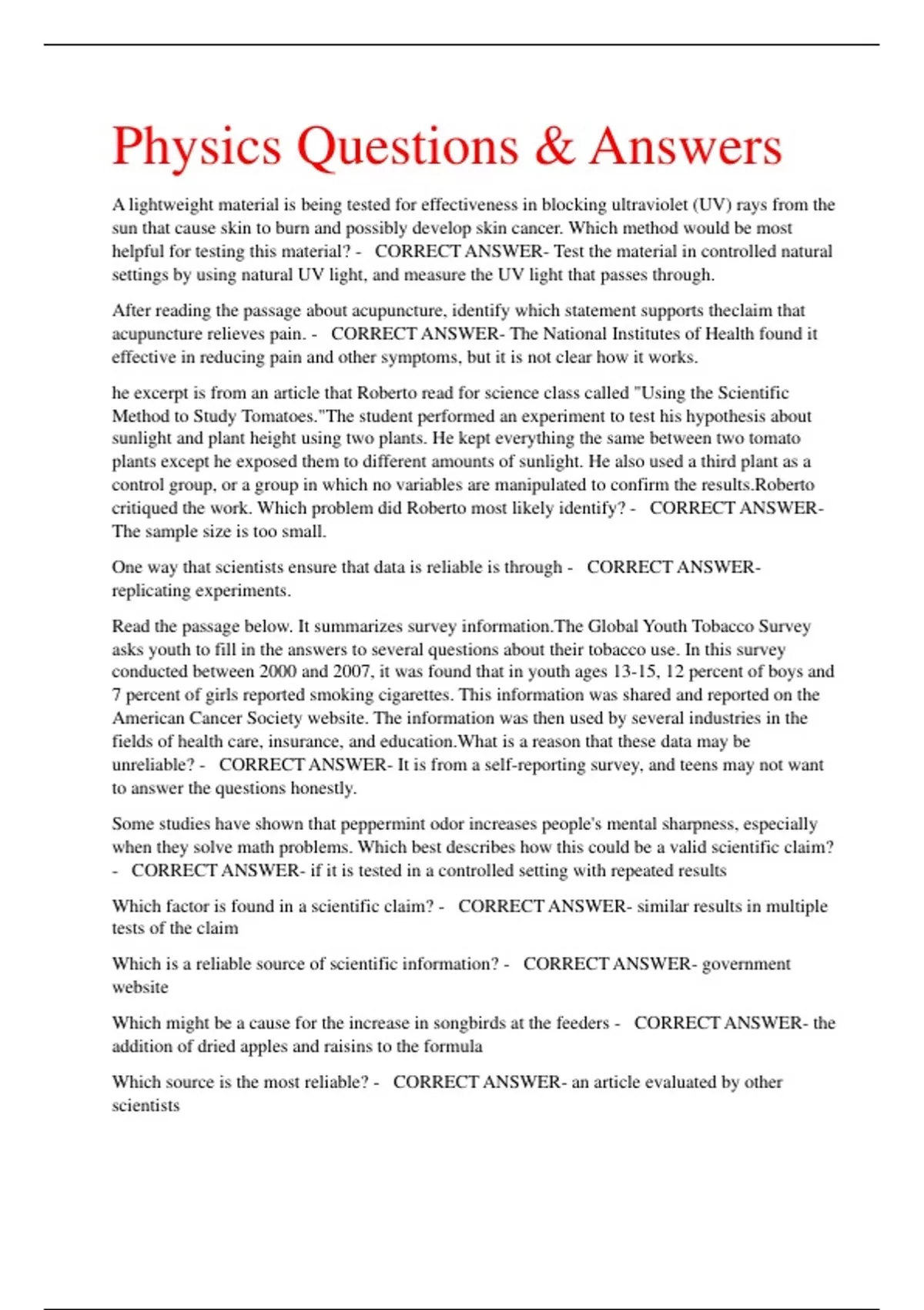 Physics Questions & Answers A lightweight material is being tested for effectiveness in blocking ultraviolet (UV) rays from the sun that cause skin to burn and possibly develop skin cancer. Which method would be most helpful for testing this material? - CORRECT ANSWER- Test the material in controlled natural settings by using natural UV light, and measure the UV light that passes through. After reading the passage about acupuncture, identify which statement supports theclaim that acupuncture relieves pain. - CORRECT ANSWER- The National Institutes of Health found it effective in reducing pain and other symptoms, but it is not clear how it works.