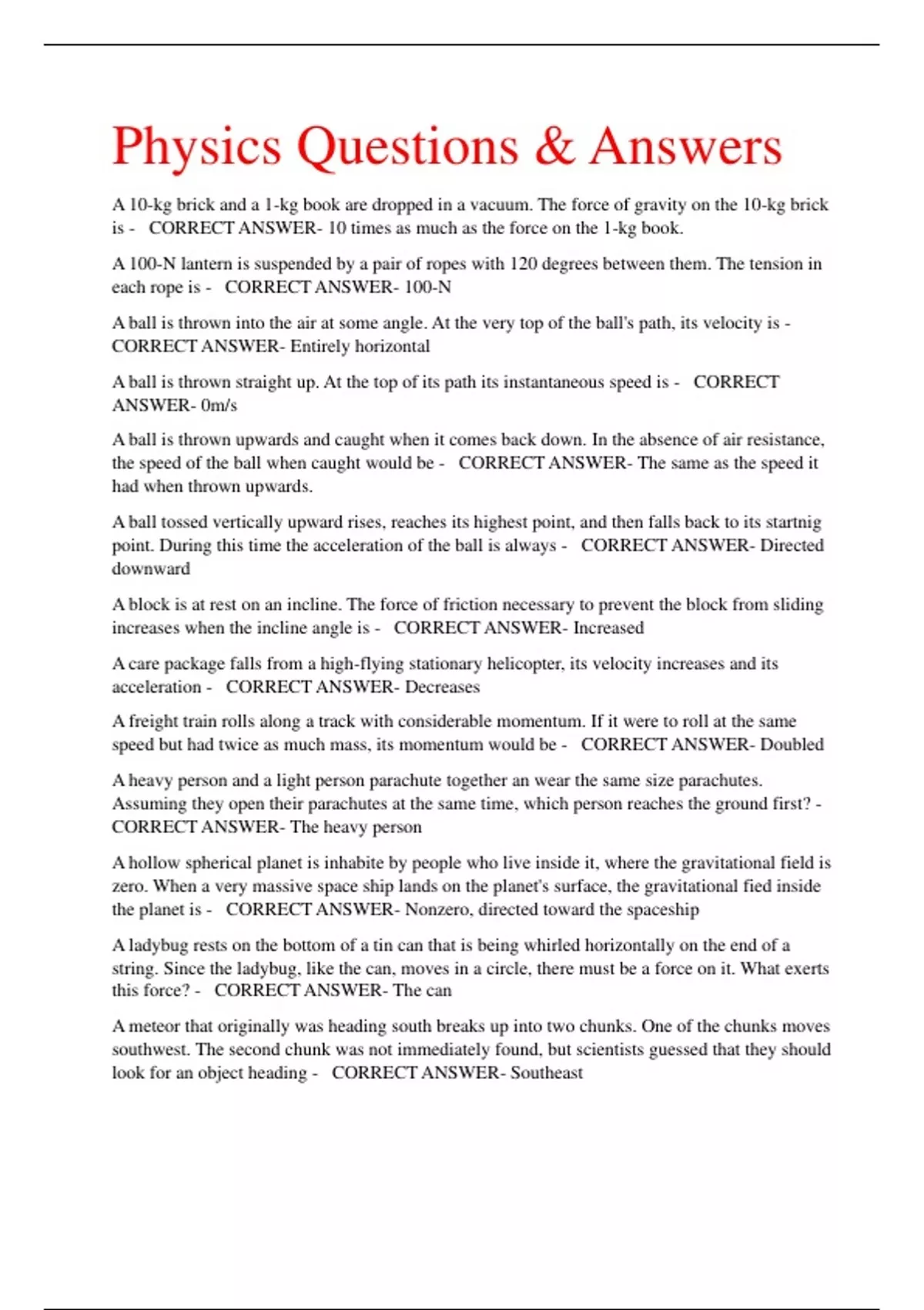Physics Questions & Answers A 10-kg brick and a 1-kg book are dropped in a vacuum. The force of gravity on the 10-kg brick is - CORRECT ANSWER- 10 times as much as the force on the 1-kg book. A 100-N lantern is suspended by a pair of ropes with 120 degrees between them. The tension in each rope is - CORRECT ANSWER- 100-N A ball is thrown into the air at some angle. At the very top of the ball's path, its velocity is - CORRECT ANSWER- Entirely horizontal A ball is thrown straight up. At the top of its path its instantaneous speed is - CORRECT ANSWER- 0m/s A ball is thrown upwards and caught when it comes back down. In the absence of air resistance, the speed of the ball when caught would be - CORRECT ANSWER- The same as the speed it had when thrown upwards. A ball tossed vertically upward rises, reaches its highest point, and then falls back to its startnig point. During this time the acceleration of the ball is always - CORRECT ANSWER- Directed downward A block is at rest on an incline. The force of friction necessary to prevent the block from sliding increases when the incline angle is - CORRECT ANSWER- Increased A care package falls from a high-flying stationary helicopter, its velocity increases and its acceleration - CORRECT ANSWER- Decreases A freight train rolls along a track with considerable momentum. If it were to roll at the same speed but had twice as much mass, its momentum would be - CORRECT ANSWER- Doubled A heavy person and a light person parachute together an wear the same size parachutes. Assuming they open their parachutes at the same time, which person reaches the ground first? - CORRECT ANSWER- The heavy person A hollow spherical planet is inhabite by people who live inside it, where the gravitational field is zero. When a very massive space ship lands on the planet's surface, the gravitational fied inside the planet is - CORRECT ANSWER- Nonzero, directed toward the spaceship A ladybug rests on the bottom of a tin can that is being whirled horizontally on the end of a string. Since the ladybug, like the can, moves in a circle, there must be a force on it. What exerts this force? - CORRECT ANSWER- The can A meteor that originally was heading south breaks up into two chunks. One of the chunks moves southwest. The second chunk was not immediately found, but scientists guessed that they should look for an object heading - CORRECT ANSWER- Southeast