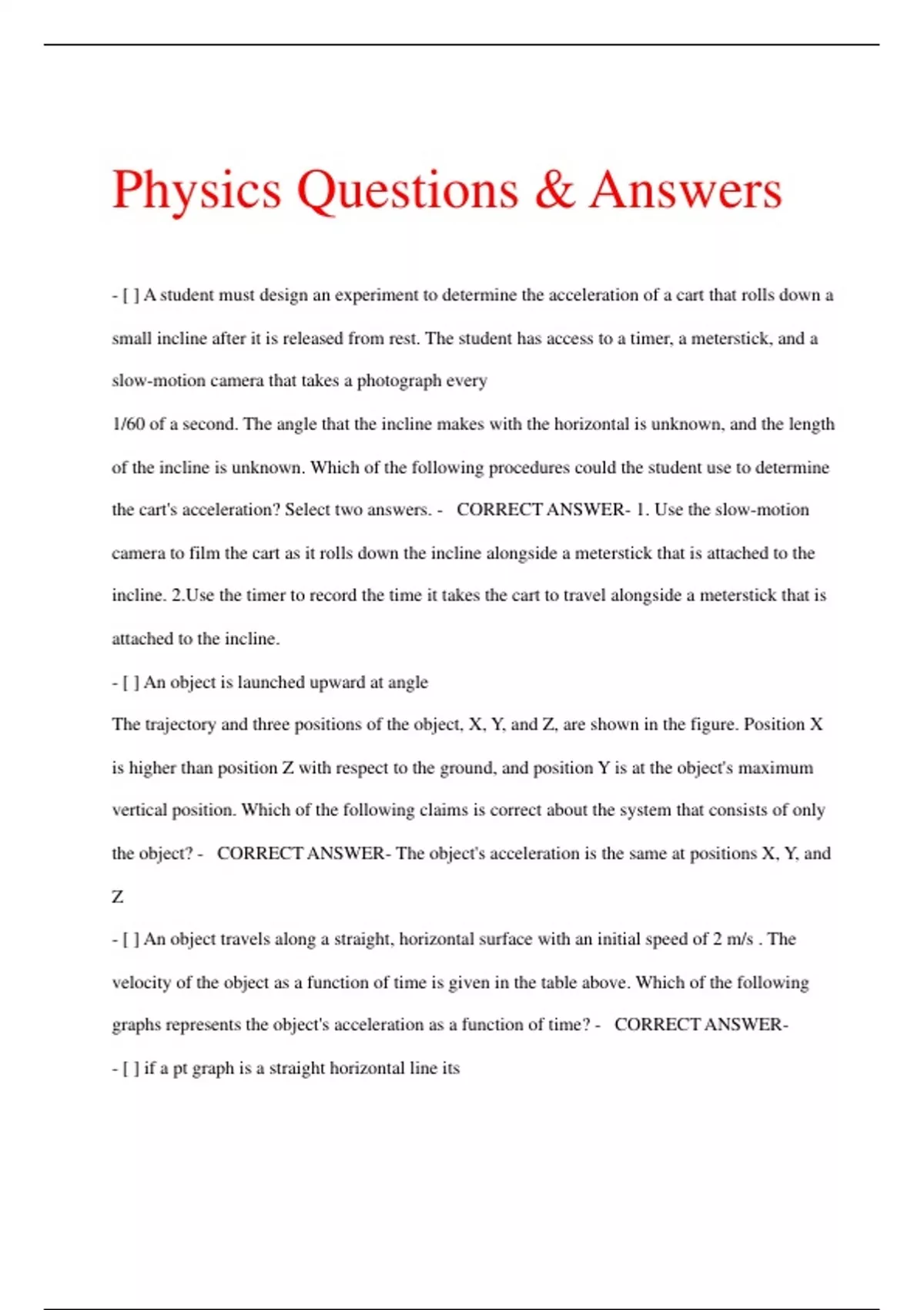 Physics Questions & Answers - [ ] A student must design an experiment to determine the acceleration of a cart that rolls down a small incline after it is released from rest. The student has access to a timer, a meterstick, and a slow-motion camera that takes a photograph every 1/60 of a second. The angle that the incline makes with the horizontal is unknown, and the length of the incline is unknown. Which of the following procedures could the student use to determine the cart's acceleration? Select two answers. - CORRECT ANSWER- 1. Use the slow-motion camera to film the cart as it rolls down the incline alongside a meterstick that is attached to the incline. 2.Use the timer to record the time it takes the cart to travel alongside a meterstick that is attached to the incline. - [ ] An object is launched upward at angle The trajectory and three positions of the object, X, Y, and Z, are shown in the figure. Position X is higher than position Z with respect to the ground, and position Y is at the object's maximum vertical position. Which of the following claims is correct about the system that consists of only the object? - CORRECT ANSWER- The object's acceleration is the same at positions X, Y, and Z - [ ] An object travels along a straight, horizontal surface with an initial speed of 2 m/s . The velocity of the object as a function of time is given in the table above. Which of the following graphs represents the object's acceleration as a function of time? - CORRECT ANSWER- - [ ] if a pt graph is a straight horizontal line its