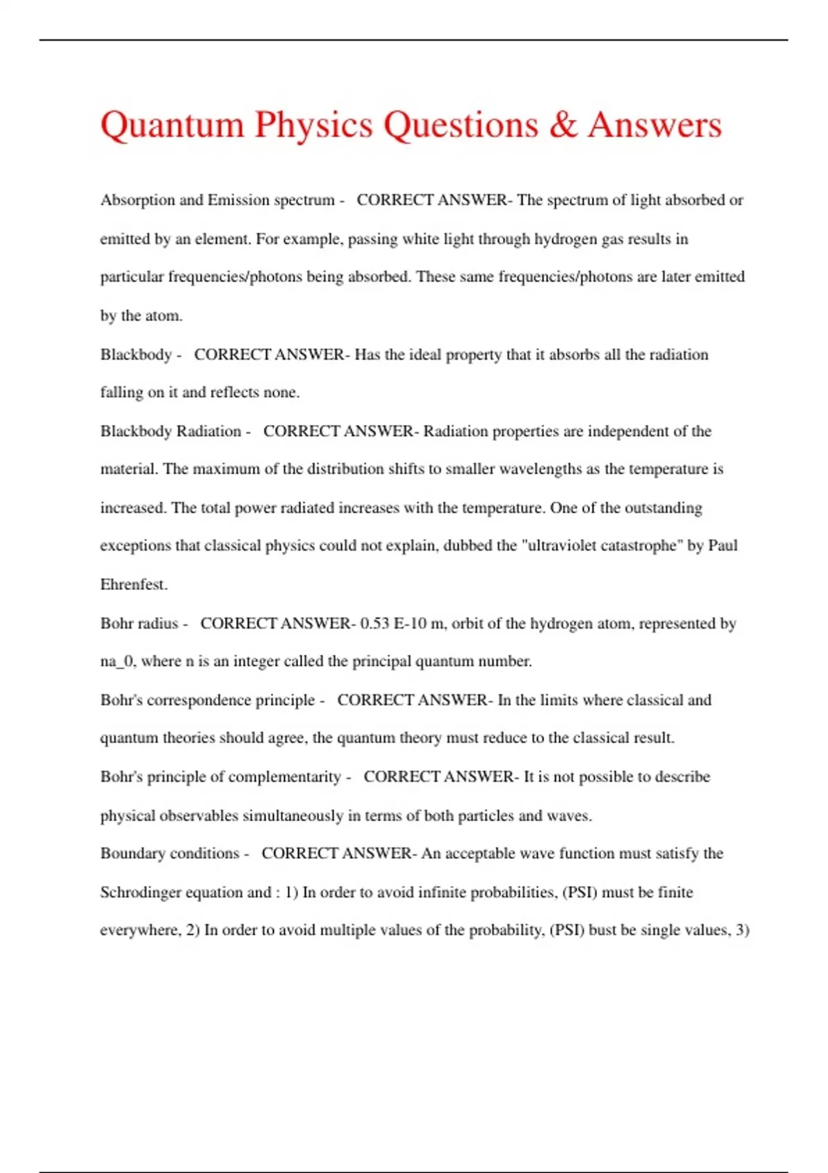 Quantum Physics Questions & Answers Absorption and Emission spectrum - CORRECT ANSWER- The spectrum of light absorbed or emitted by an element. For example, passing white light through hydrogen gas results in particular frequencies/photons being absorbed. These same frequencies/photons are later emitted by the atom. Blackbody - CORRECT ANSWER- Has the ideal property that it absorbs all the radiation falling on it and reflects none. Blackbody Radiation - CORRECT ANSWER- Radiation properties are independent of the material. The maximum of the distribution shifts to smaller wavelengths as the temperature is increased. The total power radiated increases with the temperature. One of the outstanding exceptions that classical physics could not explain, dubbed the "ultraviolet catastrophe" by Paul Ehrenfest. Bohr radius - CORRECT ANSWER- 0.53 E-10 m, orbit of the hydrogen atom, represented by na_0, where n is an integer called the principal quantum number. Bohr's correspondence principle - CORRECT ANSWER- In the limits where classical and quantum theories should agree, the quantum theory must reduce to the classical result. Bohr's principle of complementarity - CORRECT ANSWER- It is not possible to describe physical observables simultaneously in terms of both particles and waves. Boundary conditions - CORRECT ANSWER- An acceptable wave function must satisfy the Schrodinger equation and : 1) In order to avoid infinite probabilities, (PSI) must be finite everywhere, 2) In order to avoid multiple values of the probability, (PSI) bust be single values, 3)
