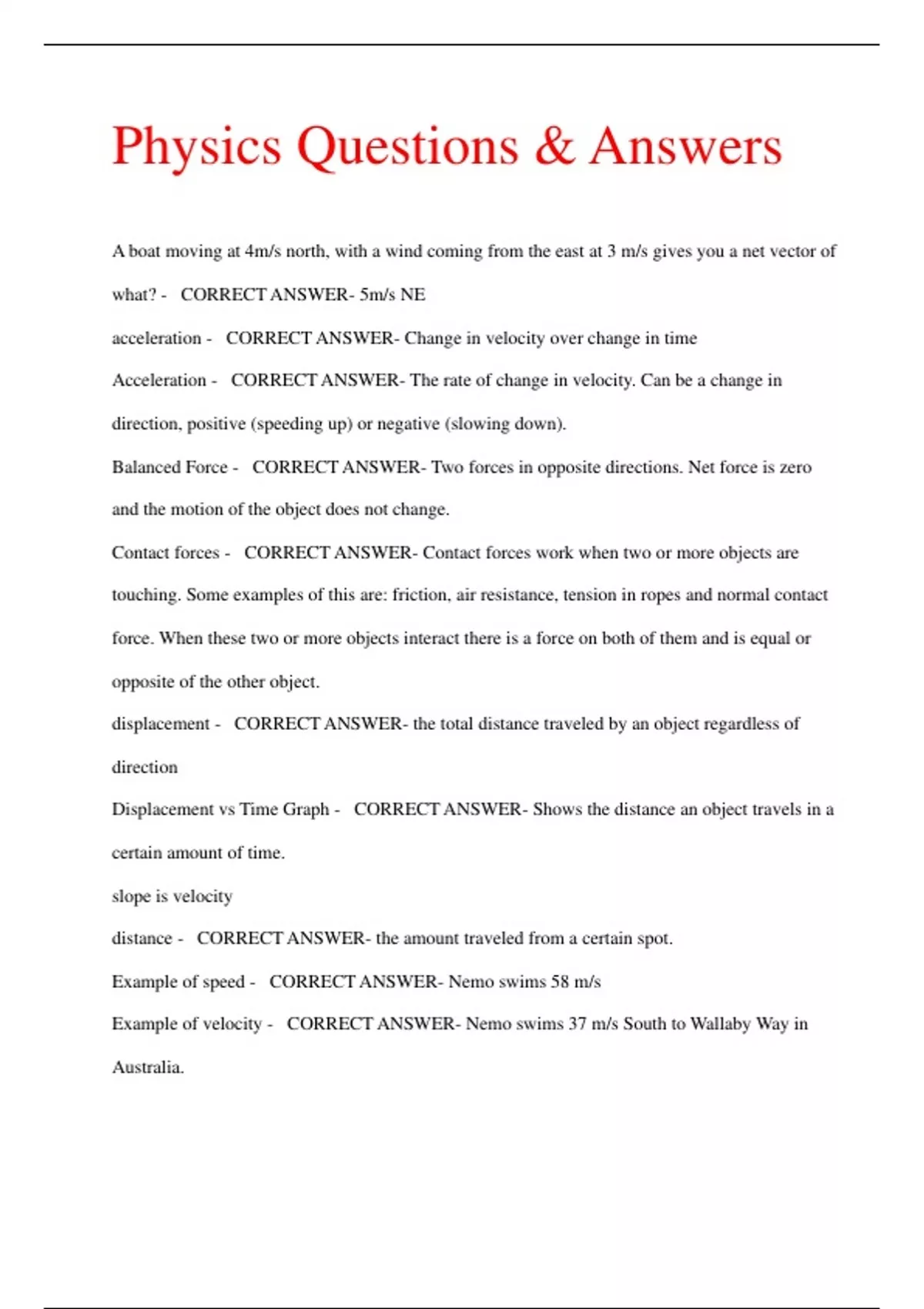 Physics Questions & Answers A boat moving at 4m/s north, with a wind coming from the east at 3 m/s gives you a net vector of what? - CORRECT ANSWER- 5m/s NE acceleration - CORRECT ANSWER- Change in velocity over change in time Acceleration - CORRECT ANSWER- The rate of change in velocity. Can be a change in direction, positive (speeding up) or negative (slowing down). Balanced Force - CORRECT ANSWER- Two forces in opposite directions. Net force is zero and the motion of the object does not change. Contact forces - CORRECT ANSWER- Contact forces work when two or more objects are touching. Some examples of this are: friction, air resistance, tension in ropes and normal contact force. When these two or more objects interact there is a force on both of them and is equal or opposite of the other object. displacement - CORRECT ANSWER- the total distance traveled by an object regardless of direction Displacement vs Time Graph - CORRECT ANSWER- Shows the distance an object travels in a certain amount of time. slope is velocity distance - CORRECT ANSWER- the amount traveled from a certain spot. Example of speed - CORRECT ANSWER- Nemo swims 58 m/s Example of velocity - CORRECT ANSWER- Nemo swims 37 m/s South to Wallaby Way in Australia.