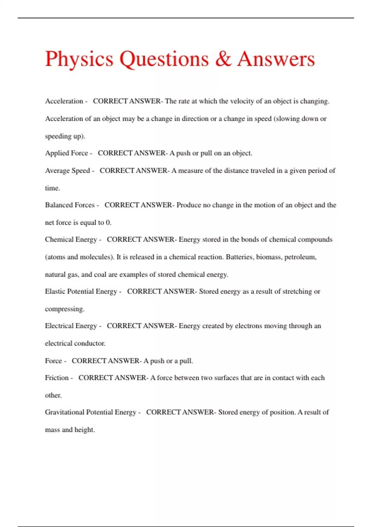 Physics Questions & Answers Acceleration - CORRECT ANSWER- The rate at which the velocity of an object is changing. Acceleration of an object may be a change in direction or a change in speed (slowing down or speeding up). Applied Force - CORRECT ANSWER- A push or pull on an object. Average Speed - CORRECT ANSWER- A measure of the distance traveled in a given period of time. Balanced Forces - CORRECT ANSWER- Produce no change in the motion of an object and the net force is equal to 0. Chemical Energy - CORRECT ANSWER- Energy stored in the bonds of chemical compounds (atoms and molecules). It is released in a chemical reaction. Batteries, biomass, petroleum, natural gas, and coal are examples of stored chemical energy. Elastic Potential Energy - CORRECT ANSWER- Stored energy as a result of stretching or compressing. Electrical Energy - CORRECT ANSWER- Energy created by electrons moving through an electrical conductor.