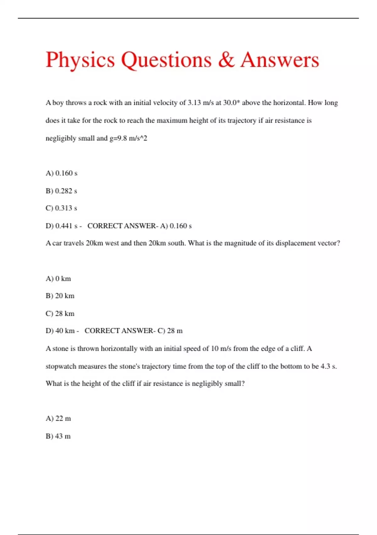Physics Questions & Answers A boy throws a rock with an initial velocity of 3.13 m/s at 30.0* above the horizontal. How long does it take for the rock to reach the maximum height of its trajectory if air resistance is negligibly small and g=9.8 m/s^2 A) 0.160 s B) 0.282 s C) 0.313 s D) 0.441 s - CORRECT ANSWER- A) 0.160 s A car travels 20km west and then 20km south. What is the magnitude of its displacement vector? A) 0 km B) 20 km C) 28 km D) 40 km - CORRECT ANSWER- C) 28 m A stone is thrown horizontally with an initial speed of 10 m/s from the edge of a cliff. A stopwatch measures the stone's trajectory time from the top of the cliff to the bottom to be 4.3 s. What is the height of the cliff if air resistance is negligibly small? A) 22 m B) 43 m C) 77 m D) 91 m - CORRECT ANSWER- D) 91 m