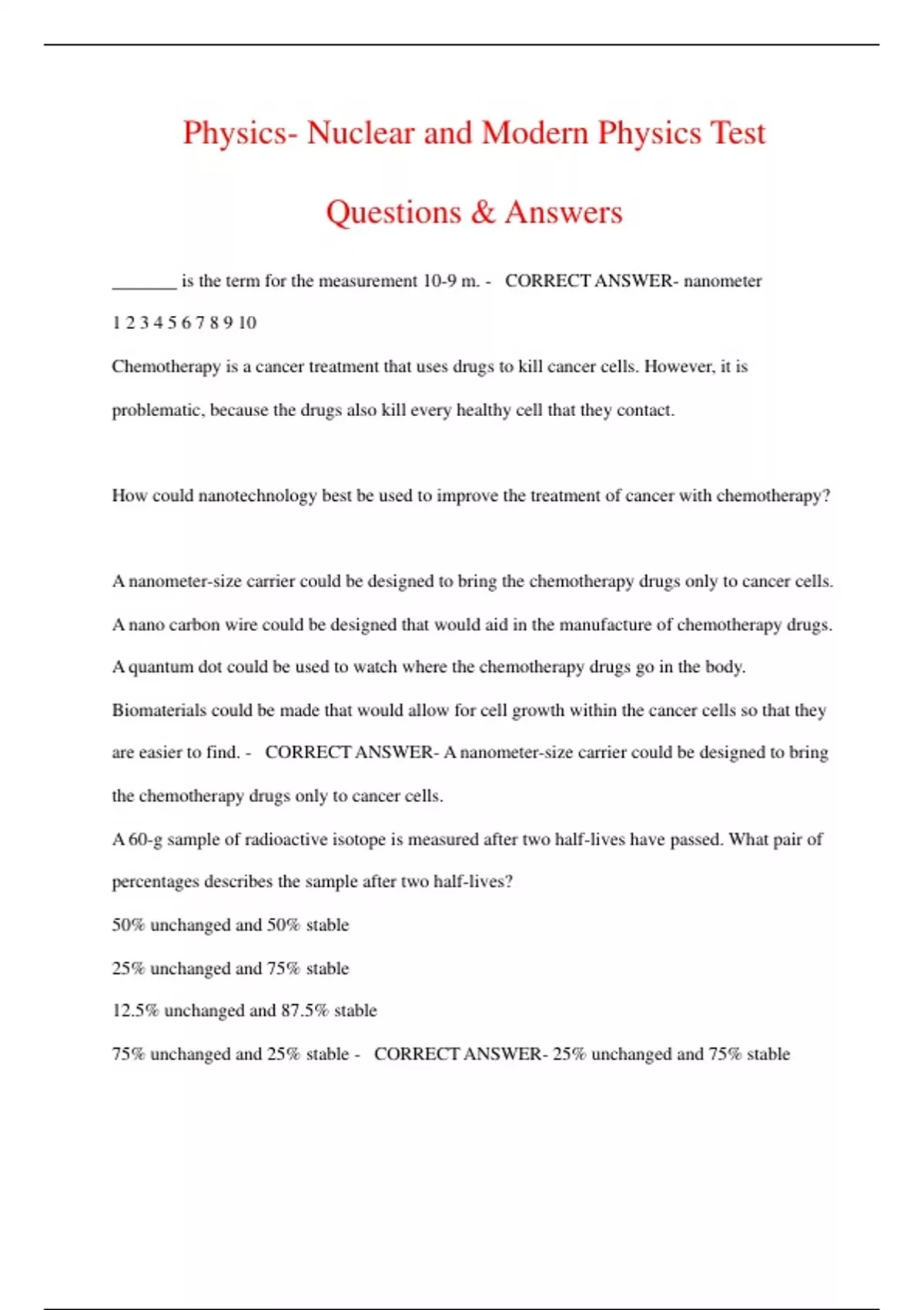 Physics- Nuclear and Modern Physics Test Questions & Answers _______ is the term for the measurement 10-9 m. - CORRECT ANSWER- nanometer 1 2 3 4 5 6 7 8 9 10 Chemotherapy is a cancer treatment that uses drugs to kill cancer cells. However, it is problematic, because the drugs also kill every healthy cell that they contact. How could nanotechnology best be used to improve the treatment of cancer with chemotherapy? A nanometer-size carrier could be designed to bring the chemotherapy drugs only to cancer cells. A nano carbon wire could be designed that would aid in the manufacture of chemotherapy drugs. A quantum dot could be used to watch where the chemotherapy drugs go in the body. Biomaterials could be made that would allow for cell growth within the cancer cells so that they are easier to find. - CORRECT ANSWER- A nanometer-size carrier could be designed to bring the chemotherapy drugs only to cancer cells. A 60-g sample of radioactive isotope is measured after two half-lives have passed. What pair of percentages describes the sample after two half-lives? 50% unchanged and 50% stable 25% unchanged and 75% stable 12.5% unchanged and 87.5% stable 75% unchanged and 25% stable - CORRECT ANSWER- 25% unchanged and 75% stable A doctor thinks a patient has an intussusception, in which a part of the intestine slides inside itself like the parts of a collapsible telescope. Which imaging technique is the doctor most likely to use? Explain. X-ray radiography is most likely because it can make an image of a large area of the body. Sonography is most likely because it has good resolution without radiation. X-ray fluoroscopy is most likely because it can monitor the movement of material in real time. A CT scan is most likely because it can form a three-dimensional image of the intestines. - CORRECT ANSWER- Sonography is most likely because it has good resolution without radiation