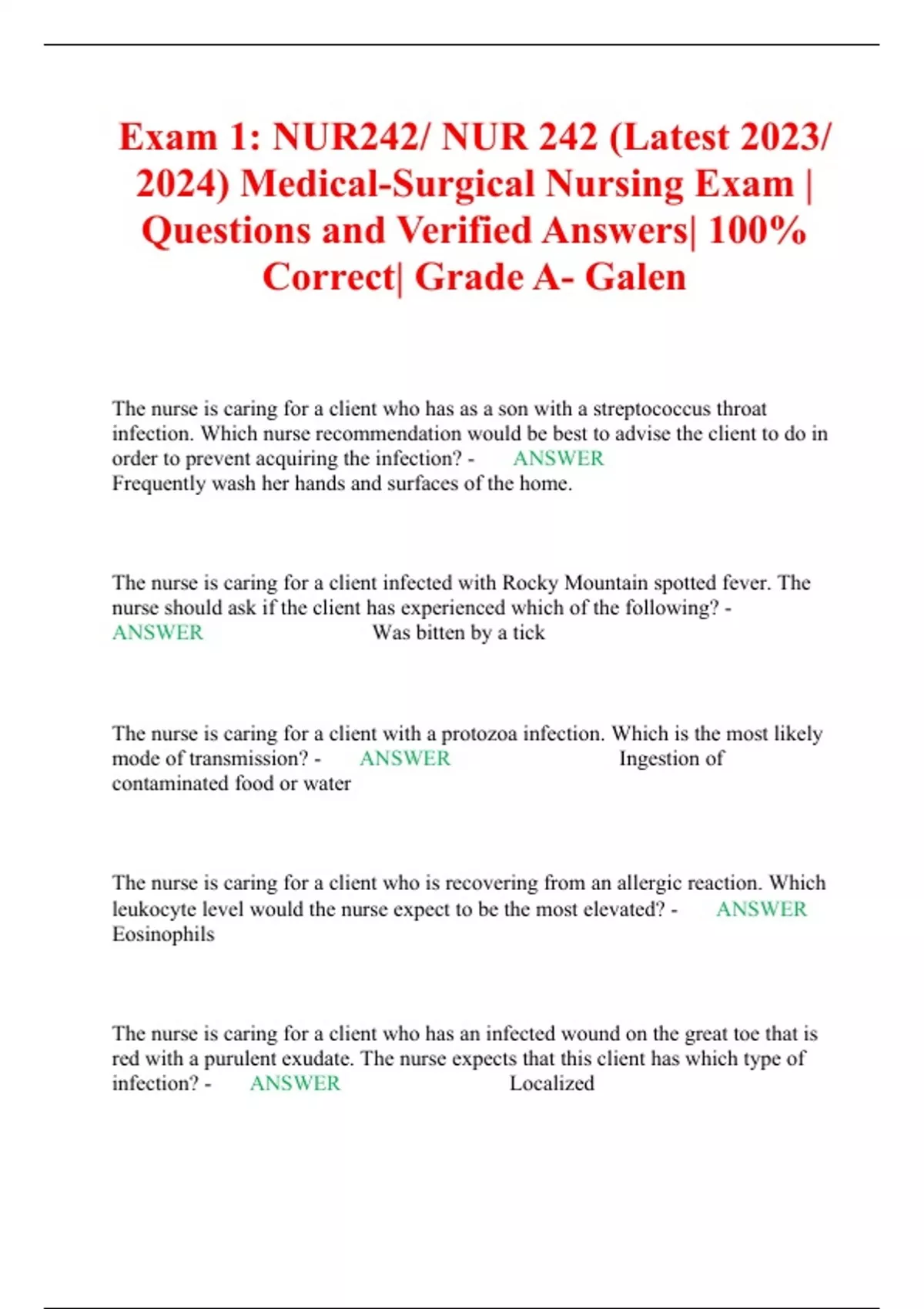 Exam 1: NUR242/ NUR 242 (Latest 2023/ 2024) Medical-Surgical Nursing Exam | Questions and Verified Answers| 100% Correct| Grade A- Galen