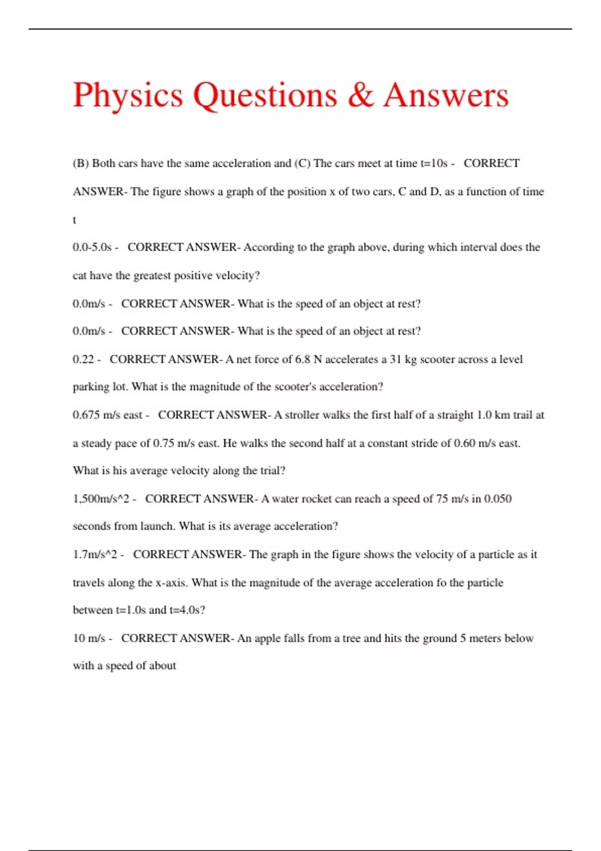 Physics Questions & Answers (B) Both cars have the same acceleration and (C) The cars meet at time t=10s - CORRECT ANSWER- The figure shows a graph of the position x of two cars, C and D, as a function of time t 0.0-5.0s - CORRECT ANSWER- According to the graph above, during which interval does the cat have the greatest positive velocity? 0.0m/s - CORRECT ANSWER- What is the speed of an object at rest? 0.0m/s - CORRECT ANSWER- What is the speed of an object at rest? 0.22 - CORRECT ANSWER- A net force of 6.8 N accelerates a 31 kg scooter across a level parking lot. What is the magnitude of the scooter's acceleration? 0.675 m/s east - CORRECT ANSWER- A stroller walks the first half of a straight 1.0 km trail at a steady pace of 0.75 m/s east. He walks the second half at a constant stride of 0.60 m/s east. What is his average velocity along the trial? 1,500m/s^2 - CORRECT ANSWER- A water rocket can reach a speed of 75 m/s in 0.050 seconds from launch. What is its average acceleration? 1.7m/s^2 - CORRECT ANSWER- The graph in the figure shows the velocity of a particle as it travels along the x-axis. What is the magnitude of the average acceleration fo the particle between t=1.0s and t=4.0s? 10 m/s - CORRECT ANSWER- An apple falls from a tree and hits the ground 5 meters below with a speed of about 10.0- 15.0s - CORRECT ANSWER- According to the graph above, the cat has the fastest speed during which interval?