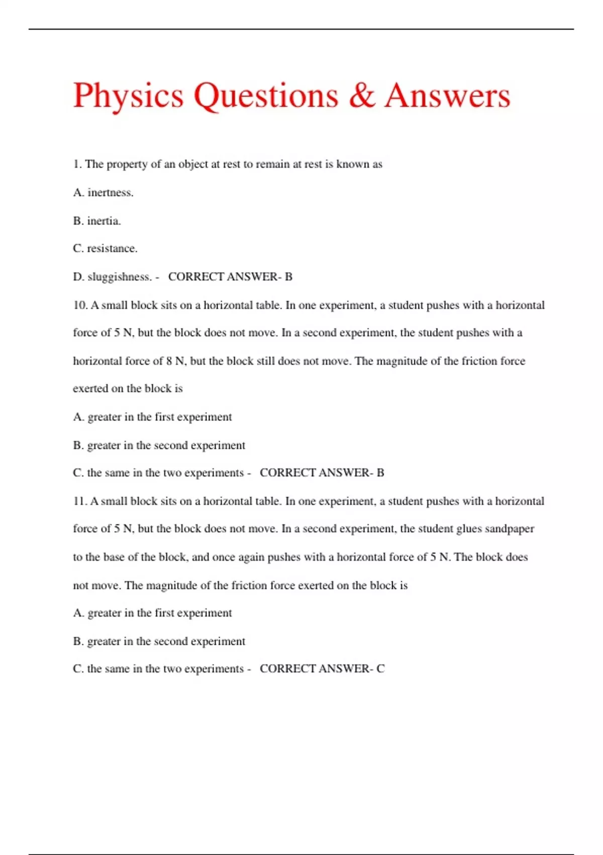 Physics Questions & Answers 1. The property of an object at rest to remain at rest is known as A. inertness. B. inertia. C. resistance. D. sluggishness. - CORRECT ANSWER- B 10. A small block sits on a horizontal table. In one experiment, a student pushes with a horizontal force of 5 N, but the block does not move. In a second experiment, the student pushes with a horizontal force of 8 N, but the block still does not move. The magnitude of the friction force exerted on the block is A. greater in the first experiment B. greater in the second experiment C. the same in the two experiments - CORRECT ANSWER- B 11. A small block sits on a horizontal table. In one experiment, a student pushes with a horizontal force of 5 N, but the block does not move. In a second experiment, the student glues sandpaper to the base of the block, and once again pushes with a horizontal force of 5 N. The block does not move. The magnitude of the friction force exerted on the block is A. greater in the first experiment B. greater in the second experiment C. the same in the two experiments - CORRECT ANSWER- C 12. A rectangular block sits on a horizontal table. In one experiment, a student pushes with a horizontal force of 5 N, but the block does not move. In a second experiment, the student tilts the block up so that it is resting on its narrow end, and once again pushes with a horizontal force of 5 N. The block still does not move. The magnitude of the friction force exerted on the block is A. greater in the first experiment B. greater in the second experiment C. the same in the two experiments - CORRECT ANSWER- C 13. In a tug-of-war, two teams pull in opposite directions on a large box. Team 1 pulls with a force of 220 N, while Team 2 pulls with a force of 190 N. The friction force exerted on the box is A. 30 N in the same direction as Team 1's pull. B. 30 N in the same direction as Team 2's pull. C. There are two friction forces, 220 N opposing Team 1's pull and 190 N opposing Team 2's pull. D. The friction force is zero,the box does not move because of its inertia. - CORRECT ANSWER- B 14. There are three forces acting on an object: 6 N to the left, 5 N to the right, and 3 N to the left. What is the net force acting on the object? A. 4 N B. 4 N left C. 4 N right D. 6 N left - CORRECT ANSWER- B 15. A woman pulls on one end of a