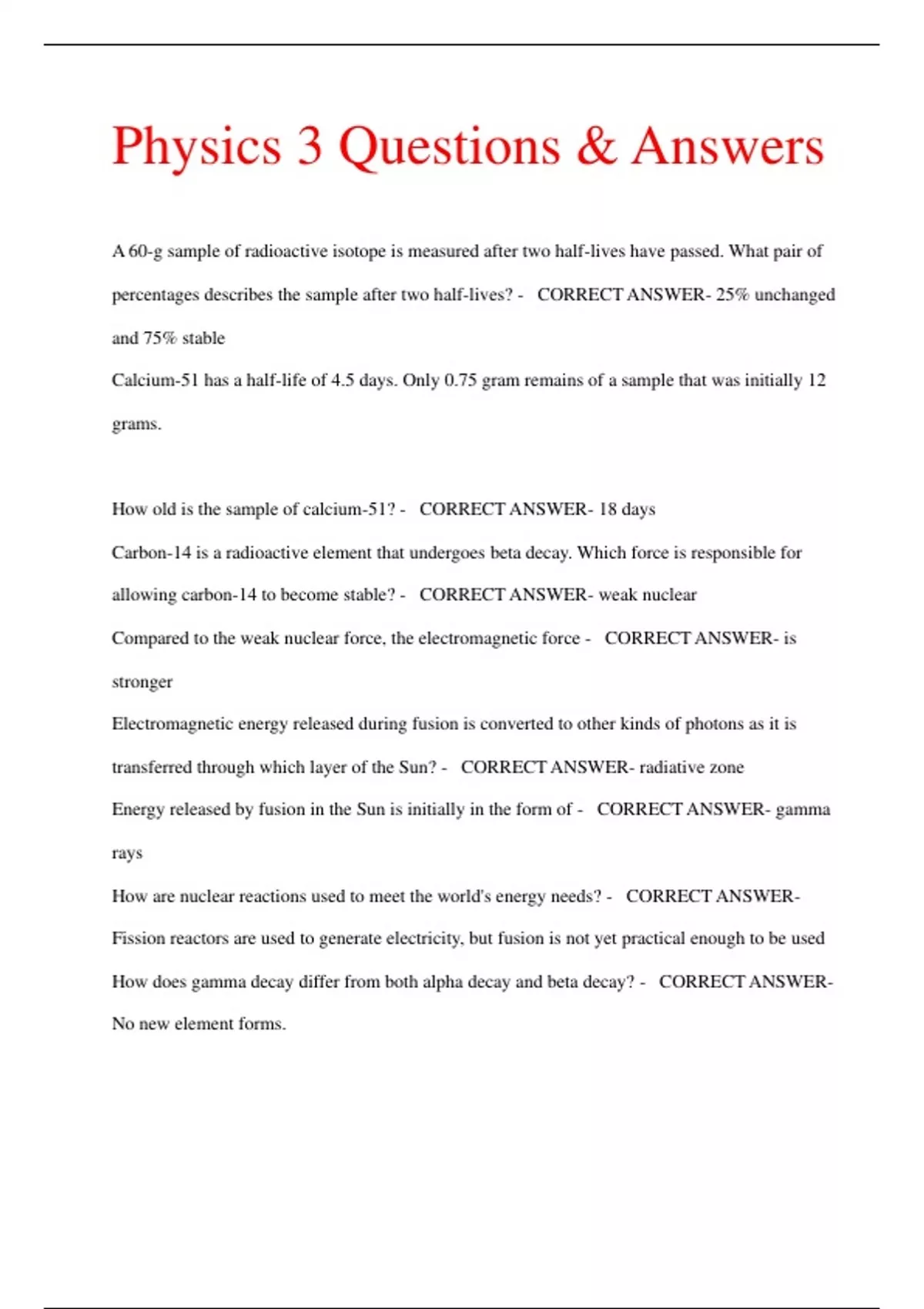 Physics 3 Questions & Answers A 60-g sample of radioactive isotope is measured after two half-lives have passed. What pair of percentages describes the sample after two half-lives? - CORRECT ANSWER- 25% unchanged and 75% stable Calcium-51 has a half-life of 4.5 days. Only 0.75 gram remains of a sample that was initially 12 grams. How old is the sample of calcium-51? - CORRECT ANSWER- 18 days Carbon-14 is a radioactive element that undergoes beta decay. Which force is responsible for allowing carbon-14 to become stable? - CORRECT ANSWER- weak nuclear Compared to the weak nuclear force, the electromagnetic force - CORRECT ANSWER- is stronger Electromagnetic energy released during fusion is converted to other kinds of photons as it is transferred through which layer of the Sun? - CORRECT ANSWER- radiative zone Energy released by fusion in the Sun is initially in the form of - CORRECT ANSWER- gamma rays How are nuclear reactions used to meet the world's energy needs? - CORRECT ANSWERFission reactors are used to generate electricity, but fusion is not yet practical enough to be used How does gamma decay differ from both alpha decay and beta decay? - CORRECT ANSWERNo new element forms.