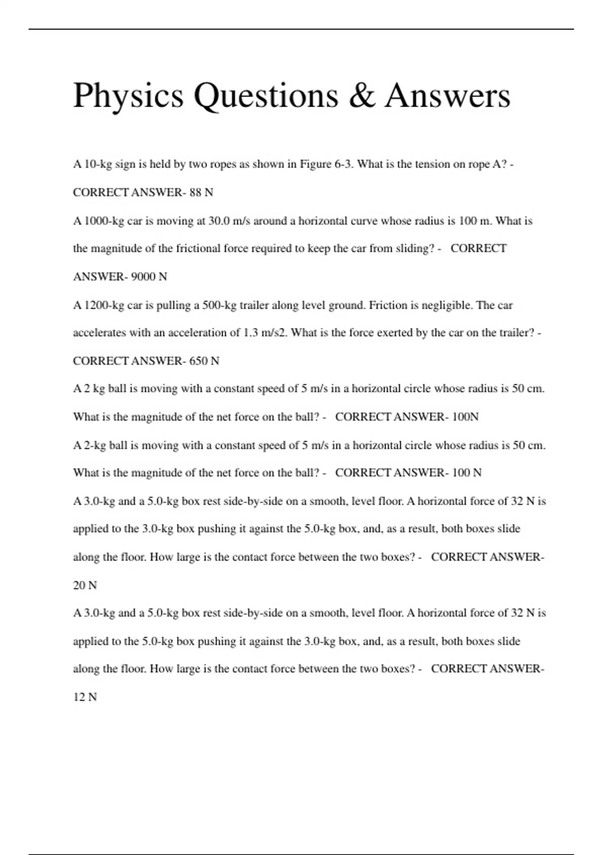 Physics Questions & Answers A 0.150 kg baseball is thrown upward with an initial speed of 20 m/s. a. What is the force on the ball when it reaches half of its maximum height? b. What is the force on the ball when it reaches its peak? - CORRECT ANSWER- a. -1.47 N b. -1.47 N A beach ball is left in the bed of a pick up truck. Describe what happens to the ball when the truck accelerates forward. - CORRECT ANSWER- The ball moves toward the back of the truck because inertia keeps it in place relative to the ground. A chair is pushed forward with a force of 185 N. The gravitational force of Earth on the chair is 155 N downward, and the floor exerts a force of 155 N upward on the chair. Draw a free body diagram showing the forces acting on the chair. - CORRECT ANSWER- Fapplied (185 N) points forward, Fg (155 N) points downward, and Fn (155 N) points upward A dog pulls on a pillow with a force of 5 N at an angle of 37 degrees above the horizontal. Find the x and y components of this force. - CORRECT ANSWER- 4 N; 3 N A large crate is placed on the bed of a truck but is not tied down. a. As the truck accelerates forward, the crate slides across the bed until it hits the tailgate. Explain what causes this. b. If the driver slammed on the brakes, what would happen to the crate? - CORRECT ANSWER- a. The inertia of the crate b. It could continue forward by inertia and hit the cab