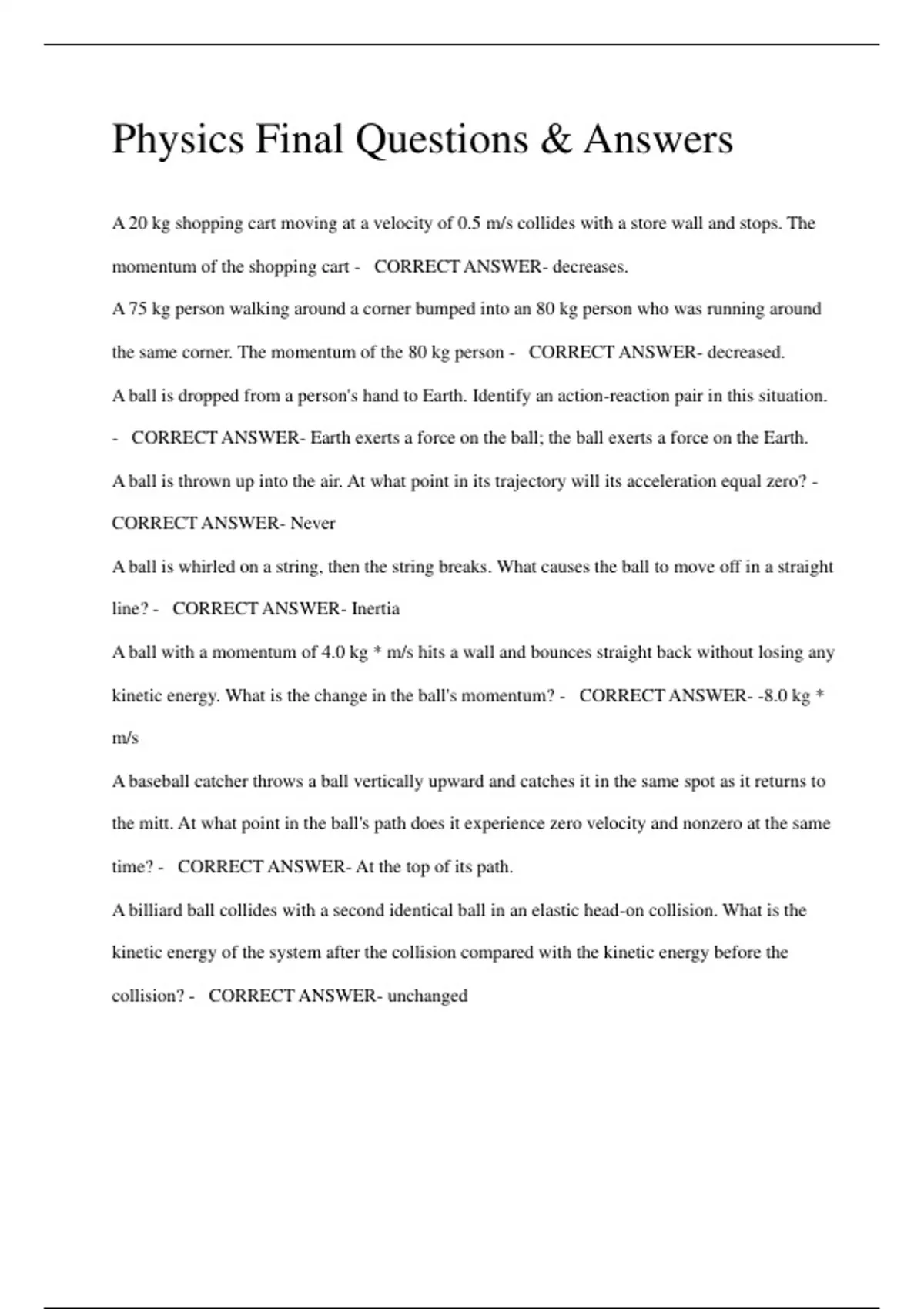 Physics Final Questions & Answers A 20 kg shopping cart moving at a velocity of 0.5 m/s collides with a store wall and stops. The momentum of the shopping cart - CORRECT ANSWER- decreases. A 75 kg person walking around a corner bumped into an 80 kg person who was running around the same corner. The momentum of the 80 kg person - CORRECT ANSWER- decreased. A ball is dropped from a person's hand to Earth. Identify an action-reaction pair in this situation. - CORRECT ANSWER- Earth exerts a force on the ball; the ball exerts a force on the Earth. A ball is thrown up into the air. At what point in its trajectory will its acceleration equal zero? - CORRECT ANSWER- Never A ball is whirled on a string, then the string breaks. What causes the ball to move off in a straight line? - CORRECT ANSWER- Inertia A ball with a momentum of 4.0 kg * m/s hits a wall and bounces straight back without losing any kinetic energy. What is the change in the ball's momentum? - CORRECT ANSWER- -8.0 kg * m/s A baseball catcher throws a ball vertically upward and catches it in the same spot as it returns to the mitt. At what point in the ball's path does it experience zero velocity and nonzero at the same time? - CORRECT ANSWER- At the top of its path. A billiard ball collides with a second identical ball in an elastic head-on collision. What is the kinetic energy of the system after the collision compared with the kinetic energy before the collision? - CORRECT ANSWER- unchanged A billiard ball collides with a stationary identical billiard ball in an elastic head-on collision. After the collision, which of the following is true of the first ball? - CORRECT ANSWER- It comes to rest. A block of wood supported by two concrete blocks is chopped in half by a karate instructor. Identify an action-reaction pair, and compare the forces exerted by each object. - CORRECT ANSWER- Guy exerts chopping force on the wood, wood exerts a chopping force on the karate instructor. A bug moves 10 cm north, 2 cm south, then 5 cm north, what is its displacement? - CORRECT ANSWER- 13 cm north A car goes forward along a level road