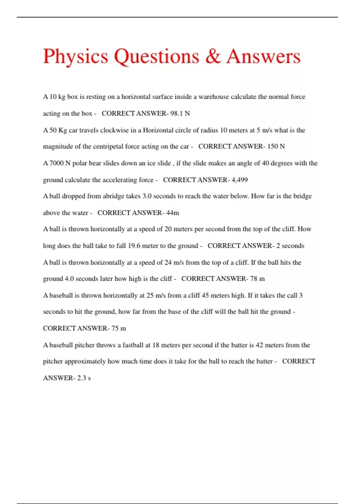 Physics Questions & Answers A 10 kg box is resting on a horizontal surface inside a warehouse calculate the normal force acting on the box - CORRECT ANSWER- 98.1 N A 50 Kg car travels clockwise in a Horizontal circle of radius 10 meters at 5 m/s what is the magnitude of the centripetal force acting on the car - CORRECT ANSWER- 150 N A 7000 N polar bear slides down an ice slide , if the slide makes an angle of 40 degrees with the ground calculate the accelerating force - CORRECT ANSWER- 4,499 A ball dropped from abridge takes 3.0 seconds to reach the water below. How far is the bridge above the water - CORRECT ANSWER- 44m A ball is thrown horizontally at a speed of 20 meters per second from the top of the cliff. How long does the ball take to fall 19.6 meter to the ground - CORRECT ANSWER- 2 seconds A ball is thrown horizontally at a speed of 24 m/s from the top of a cliff. If the ball hits the ground 4.0 seconds later how high is the cliff - CORRECT ANSWER- 78 m A baseball is thrown horizontally at 25 m/s from a cliff 45 meters high. If it takes the call 3 seconds to hit the ground, how far from the base of the cliff will the ball hit the ground - CORRECT ANSWER- 75 m A baseball pitcher throws a fastball at 18 meters per second if the batter is 42 meters from the pitcher approximately how much time does it take for the ball to reach the batter - CORRECT ANSWER- 2.3 s