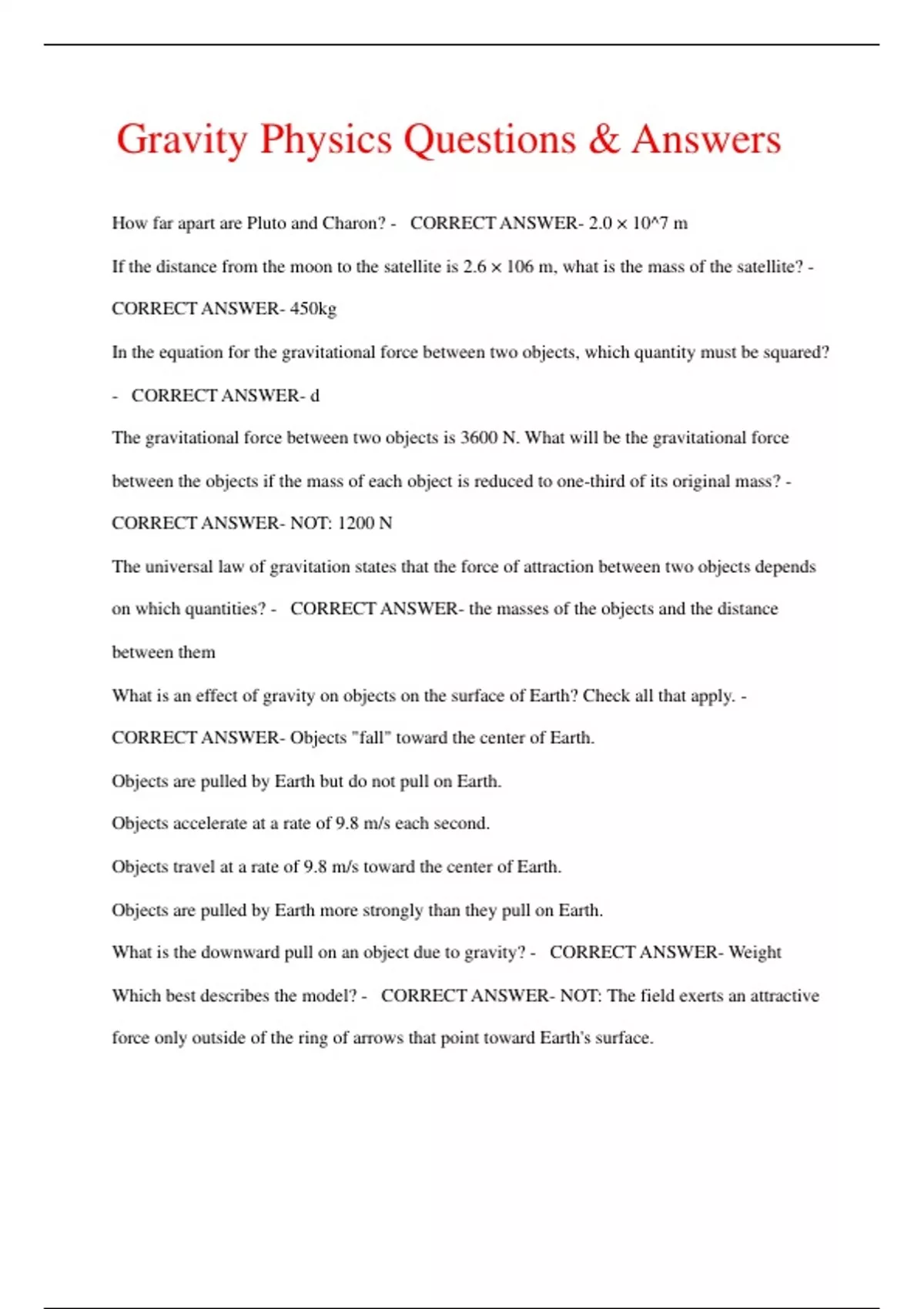 Gravity Physics Questions & Answers How far apart are Pluto and Charon? - CORRECT ANSWER- 2.0 × 10^7 m If the distance from the moon to the satellite is 2.6 × 106 m, what is the mass of the satellite? - CORRECT ANSWER- 450kg In the equation for the gravitational force between two objects, which quantity must be squared? - CORRECT ANSWER- d The gravitational force between two objects is 3600 N. What will be the gravitational force between the objects if the mass of each object is reduced to one-third of its original mass? - CORRECT ANSWER- NOT: 1200 N The universal law of gravitation states that the force of attraction between two objects depends on which quantities? - CORRECT ANSWER- the masses of the objects and the distance between them What is an effect of gravity on objects on the surface of Earth? Check all that apply. - CORRECT ANSWER- Objects "fall" toward the center of Earth. Objects are pulled by Earth but do not pull on Earth. Objects accelerate at a rate of 9.8 m/s each second. Objects travel at a rate of 9.8 m/s toward the center of Earth. Objects are pulled by Earth more strongly than they pull on Earth
