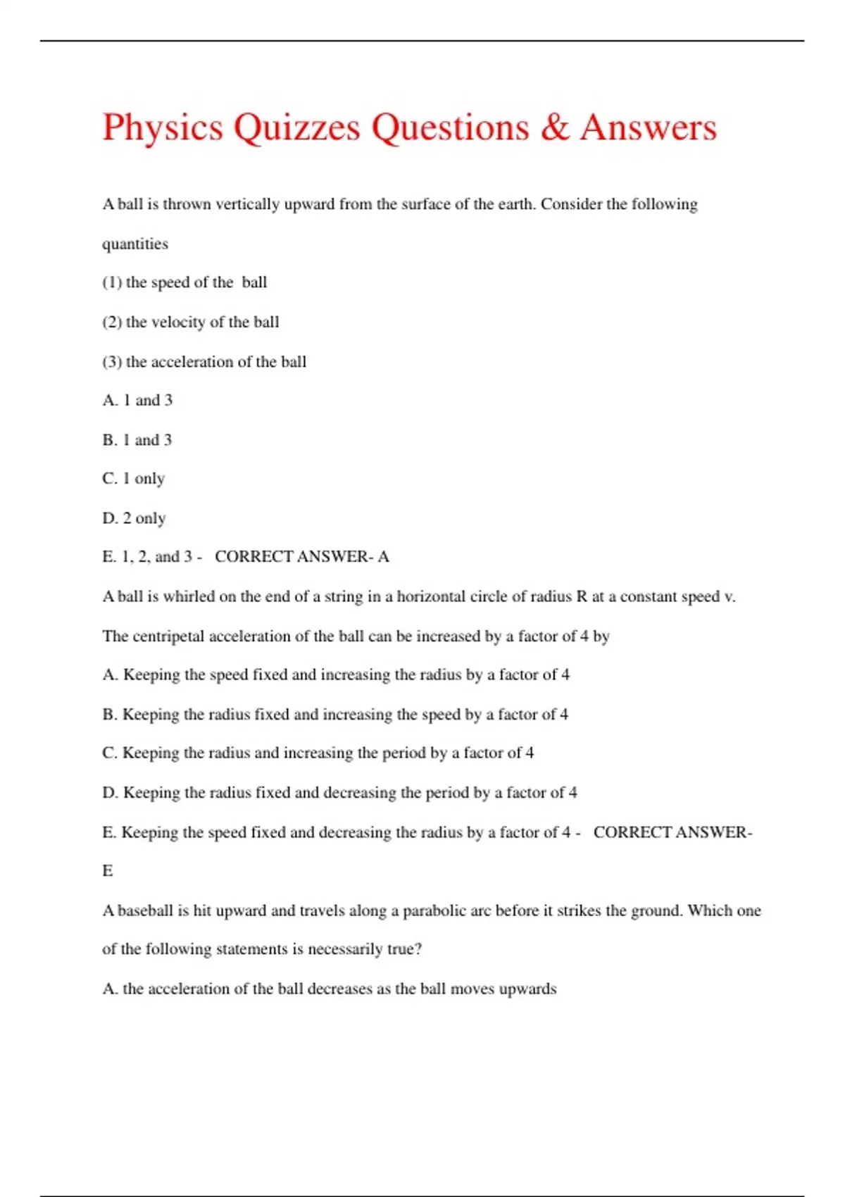 Physics Quizzes Questions & Answers A ball is thrown vertically upward from the surface of the earth. Consider the following quantities (1) the speed of the ball (2) the velocity of the ball (3) the acceleration of the ball A. 1 and 3 B. 1 and 3 C. 1 only D. 2 only E. 1, 2, and 3 - CORRECT ANSWER- A A ball is whirled on the end of a string in a horizontal circle of radius R at a constant speed v. The centripetal acceleration of the ball can be increased by a factor of 4 by A. Keeping the speed fixed and increasing the radius by a factor of 4 B. Keeping the radius fixed and increasing the speed by a factor of 4 C. Keeping the radius and increasing the period by a factor of 4 D. Keeping the radius fixed and decreasing the period by a factor of 4 E. Keeping the speed fixed and decreasing the radius by a factor of 4 - CORRECT ANSWERE A baseball is hit upward and travels along a parabolic arc before it strikes the ground. Which one of the following statements is necessarily true? A. the acceleration of the ball decreases as the ball moves upwards
