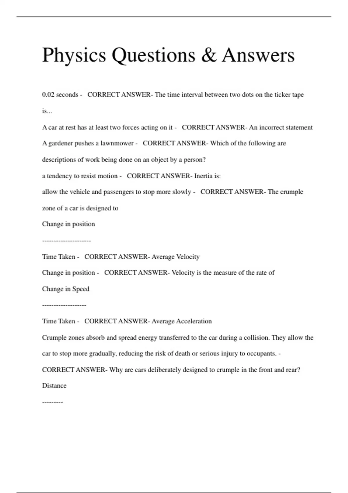 Physics Questions & Answers 0.02 seconds - CORRECT ANSWER- The time interval between two dots on the ticker tape is... A car at rest has at least two forces acting on it - CORRECT ANSWER- An incorrect statement A gardener pushes a lawnmower - CORRECT ANSWER- Which of the following are descriptions of work being done on an object by a person? a tendency to resist motion - CORRECT ANSWER- Inertia is: allow the vehicle and passengers to stop more slowly - CORRECT ANSWER- The crumple zone of a car is designed to Change in position --------------------- Time Taken - CORRECT ANSWER- Average Velocity Change in position - CORRECT ANSWER- Velocity is the measure of the rate of Change in Speed ------------------- Time Taken - CORRECT ANSWER- Average Acceleration Crumple zones absorb and spread energy transferred to the car during a collision. They allow the car to stop more gradually, reducing the risk of death or serious injury to occupants. - CORRECT ANSWER- Why are cars deliberately designed to crumple in the front and rear? Distance