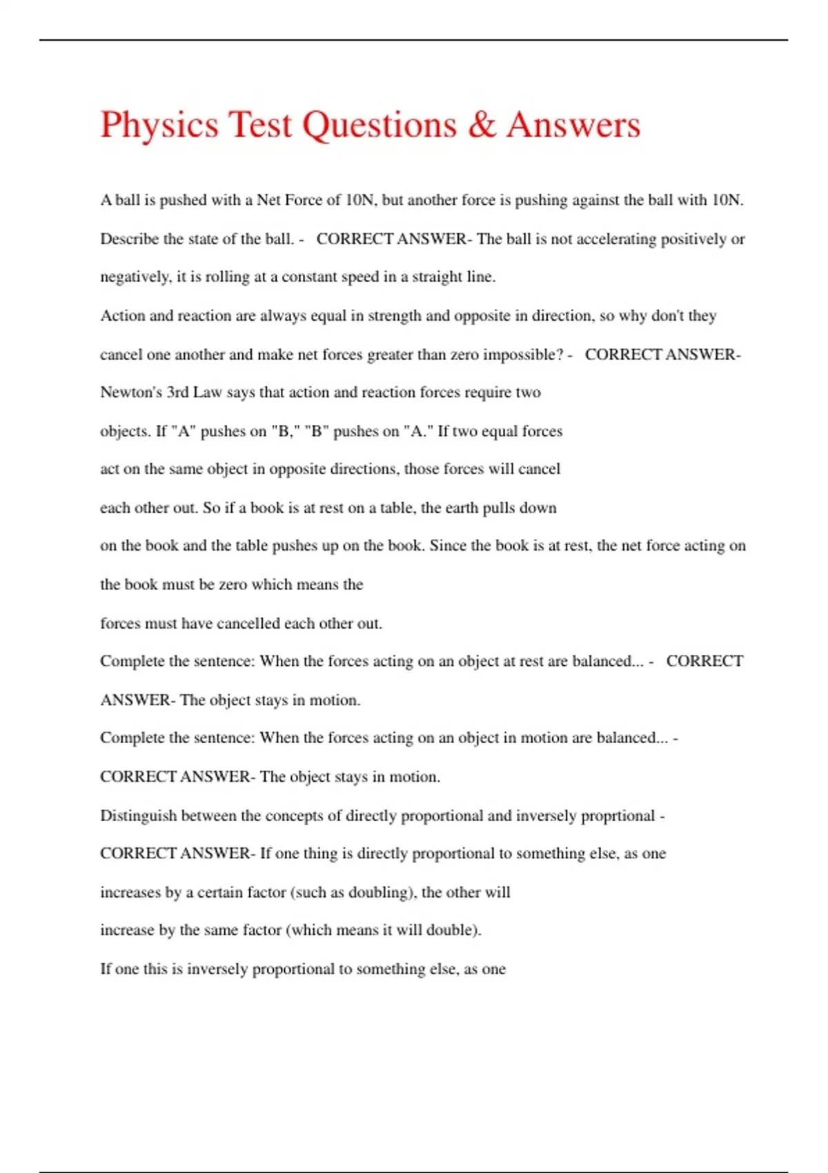 Physics Test Questions & Answers A ball is pushed with a Net Force of 10N, but another force is pushing against the ball with 10N. Describe the state of the ball. - CORRECT ANSWER- The ball is not accelerating positively or negatively, it is rolling at a constant speed in a straight line. Action and reaction are always equal in strength and opposite in direction, so why don't they cancel one another and make net forces greater than zero impossible? - CORRECT ANSWERNewton's 3rd Law says that action and reaction forces require two objects. If "A" pushes on "B," "B" pushes on "A." If two equal forces act on the same object in opposite directions, those forces will cancel each other out. So if a book is at rest on a table, the earth pulls down on the book and the table pushes up on the book. Since the book is at rest, the net force acting on the book must be zero which means the forces must have cancelled each other out. Complete the sentence: When the forces acting on an object at rest are balanced... - CORRECT ANSWER- The object stays in motion. Complete the sentence: When the forces acting on an object in motion are balanced... - CORRECT ANSWER- The object stays in motion. Distinguish between the concepts of directly proportional and inversely proprtional - CORRECT ANSWER- If one thing is directly proportional to something else, as one increases by a certain factor (such as doubling), the other will increase by the same factor (which means it will double). If one this is inversely proportional to something else, as one