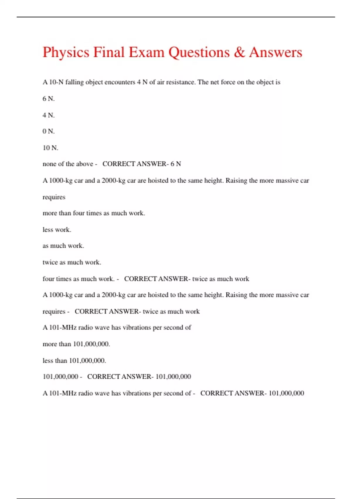 Physics Final Exam Questions & Answers A 10-N falling object encounters 4 N of air resistance. The net force on the object is 6 N. 4 N. 0 N. 10 N. none of the above - CORRECT ANSWER- 6 N A 1000-kg car and a 2000-kg car are hoisted to the same height. Raising the more massive car requires more than four times as much work. less work. as much work. twice as much work. four times as much work. - CORRECT ANSWER- twice as much work A 1000-kg car and a 2000-kg car are hoisted to the same height. Raising the more massive car requires - CORRECT ANSWER- twice as much work A 101-MHz radio wave has vibrations per second of more than 101,000,000. less than 101,000,000. 101,000,000 - CORRECT ANSWER- 101,000,000 A 101-MHz radio wave has vibrations per second of - CORRECT ANSWER- 101,000,000 A 1056-hertz tuning fork is struck at the same time as a note on the piano and you hear 2 beats/second. You tighten the piano string very slightly and then hear 3 beats/second. What is the frequency of the piano string? 1059 hertz 1058 hertz 1054 hertz 1056 hertz 1053 hertz - CORRECT ANSWER- 1059 hertz A 300-kg bear grasping a vertical tree slides down at constant velocity. The friction force between the tree and the bear is 3000 N. more than 3000 N. 30 N. 300 N. - CORRECT ANSWER- 3000 N A 60-W and a 100-W light bulb are connected in series to a 120-V outlet. Which bulb draws more current? 100-W bulb 60-W bulb both the same - CORRECT ANSWER- both the same A bag of groceries that has a mass of 10 kilograms weighs about 100 N. 1000 N. 1 N. 10 N. greater than 1000 N. - CORRECT ANSWER- 100 N A ball rolling down an incline has its maximum potential energy at the top. the bottom. halfway down. a quarter of the way down. - CORRECT ANSWER- the top A ball rolling down an incline has its maximum potential energy at - CORRECT ANSWER- the top A balloon will stick to a wooden wall if the balloon is charged positively