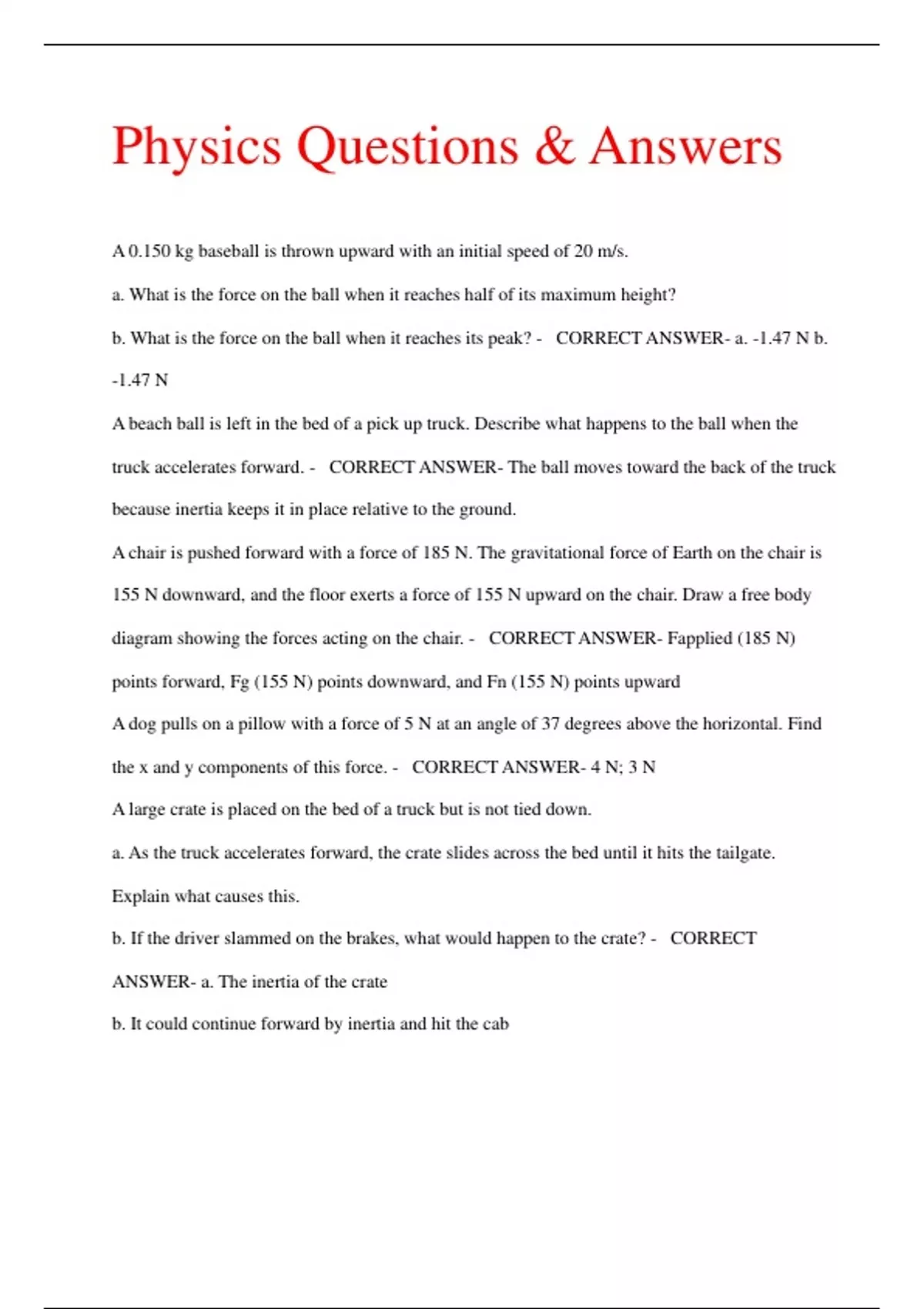 Physics Questions & Answers A 0.150 kg baseball is thrown upward with an initial speed of 20 m/s. a. What is the force on the ball when it reaches half of its maximum height? b. What is the force on the ball when it reaches its peak? - CORRECT ANSWER- a. -1.47 N b. -1.47 N A beach ball is left in the bed of a pick up truck. Describe what happens to the ball when the truck accelerates forward. - CORRECT ANSWER- The ball moves toward the back of the truck because inertia keeps it in place relative to the ground. A chair is pushed forward with a force of 185 N. The gravitational force of Earth on the chair is 155 N downward, and the floor exerts a force of 155 N upward on the chair. Draw a free body diagram showing the forces acting on the chair. - CORRECT ANSWER- Fapplied (185 N) points forward, Fg (155 N) points downward, and Fn (155 N) points upward A dog pulls on a pillow with a force of 5 N at an angle of 37 degrees above the horizontal. Find the x and y components of this force. - CORRECT ANSWER- 4 N; 3 N A large crate is placed on the bed of a truck but is not tied down. a. As the truck accelerates forward, the crate slides across the bed until it hits the tailgate. Explain what causes this. b. If the driver slammed on the brakes, what would happen to the crate? - CORRECT ANSWER- a. The inertia of the crate b. It could continue forward by inertia and hit the cab