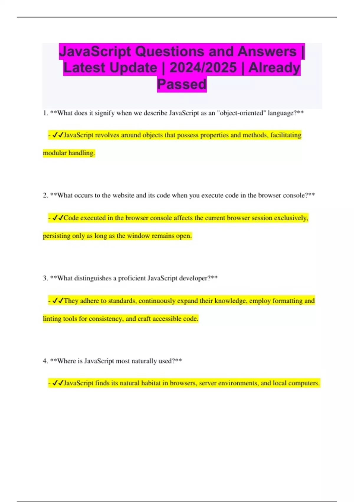 JavaScript Questions and Answers | Latest Update | 2024/2025 | Already Passed 1. **What does it signify when we describe JavaScript as an "object-oriented" language?** - JavaScript revolves around objects that possess properties and methods, facilitating modular handling. 2. **What occurs to the website and its code when you execute code in the browser console?** - Code executed in the browser console affects the current browser session exclusively, persisting only as long as the window remains open. 3. **What distinguishes a proficient JavaScript developer?** - They adhere to standards, continuously expand their knowledge, employ formatting and linting tools for consistency, and craft accessible code. 4. **Where is JavaScript most naturally used?** - JavaScript finds its natural habitat in browsers, server environments, and local computers. 5. **What exactly is ECMAScript?** - ECMAScript refers to the specification detailing how browsers should interpret and implement JavaScript. 6. **Why have command-line tools and automation gained popularity in JavaScript development?** - These tools simplify intricate processes and introduce features that aid developers in writing higher-quality code. 7. **Where should you ideally develop and test your JavaScript code?** - Develop in a code editor and test across multiple browser environments. 8. **When does the browser execute JavaScript?** - By default, JavaScript executes when encountered. If set to "async", it executes when fully loaded. If set to "defer", it waits until the entire HTML
