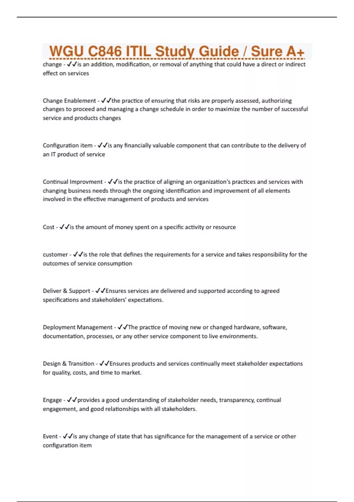 change - is an addition, modification, or removal of anything that could have a direct or indirect effect on services Change Enablement - the practice of ensuring that risks are properly assessed, authorizing changes to proceed and managing a change schedule in order to maximize the number of successful service and products changes Configuration item - is any financially valuable component that can contribute to the delivery of an IT product of service Continual Improvment - is the practice of aligning an organization's practices and services with changing business needs through the ongoing identification and improvement of all elements involved in the effective management of products and services