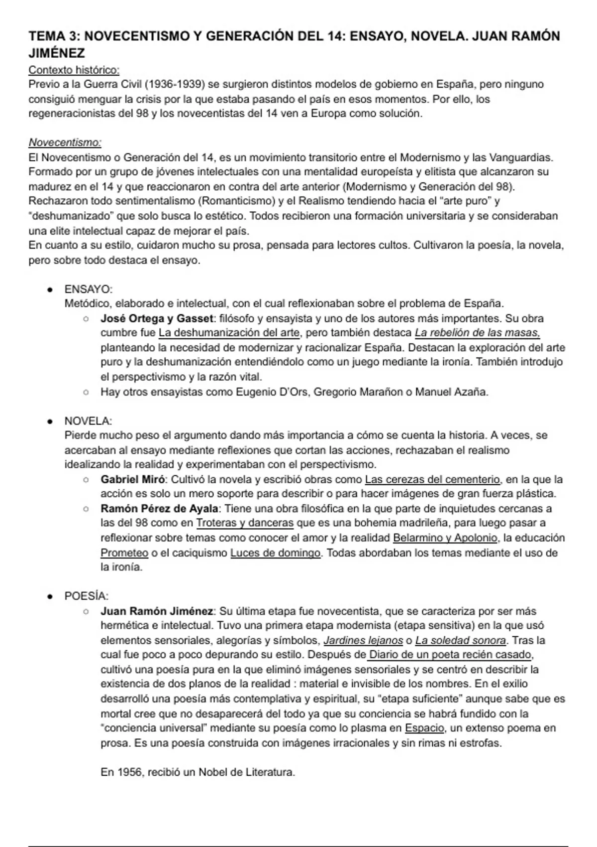 TEMA 3: NOVECENTISMO Y GENERACIÓN DEL 14: ENSAYO, NOVELA. JUAN RAMÓN