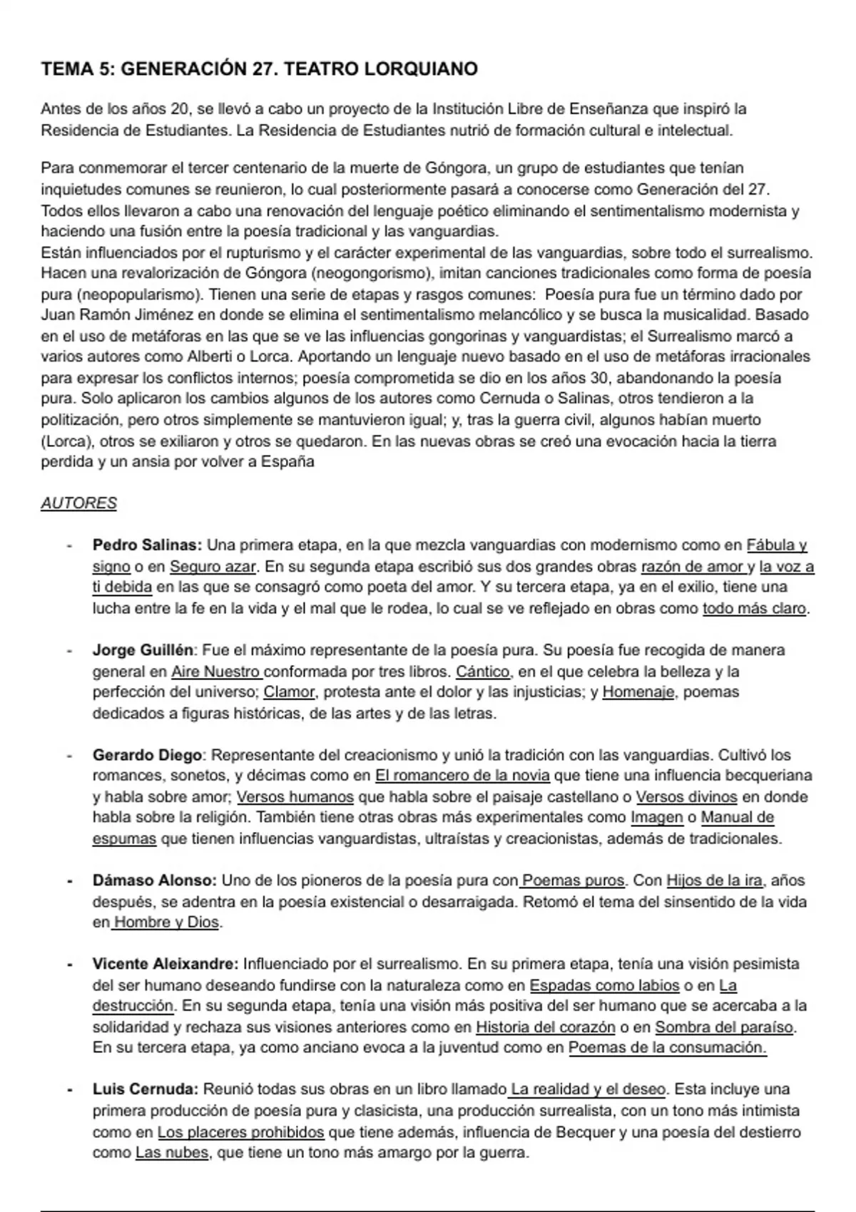 Resumen tema 5 de 2 bachillerato que se centra en la generación del 27 y todos los autores que la componían