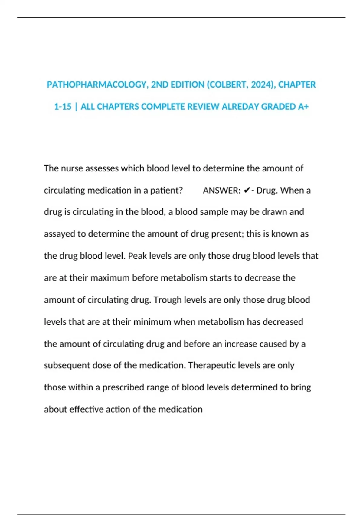 PATHOPHARMACOLOGY, 2ND EDITION (COLBERT, 2024), CHAPTER 1-15 | ALL CHAPTERS COMPLETE REVIEW ALREDAY GRADED A+