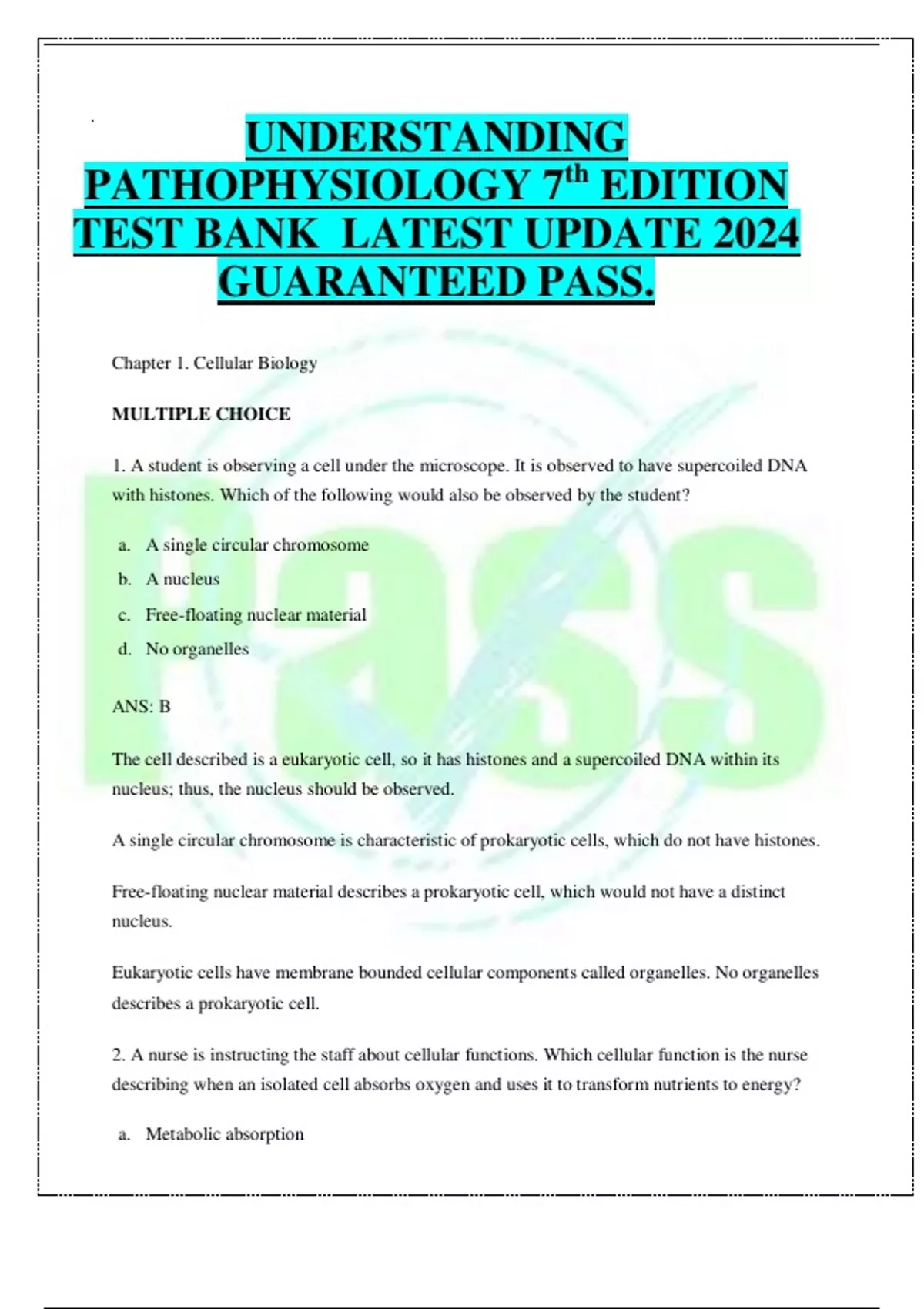 UNDERSTANDING PATHOPHYSIOLO GY 7th EDITION TEST BANK LATEST UPDATE 2024 GUARANTEED PASS. Chapter 1. Cellular Biology MULTIPLE CHOICE 1. A student is observing a cell under the microscope. It is observed to have supercoiled DNA with histones. Which of the following would also be observed by the student? a. A single circular chromosome b. A nucleus c. Free-floating nuclear material d. No organelles ANS: B The cell described is a eukaryotic cell, so it has histones and a supercoiled DNA within its nucleus; thus, the nucleus should be observed. A single circular chromosome is characteristic of prokaryotic cells, which do not have histones. Free-floating nuclear material describes a prokaryotic cell, which would not have a distinct nucleus. Eukaryotic cells have membrane bounded cellular components called organelles. No organelles describes a prokaryotic cell. 2. A nurse is instructing the staff about cellular functions. Which cellular function is the nurse describing when an isolated cell absorbs oxygen and uses it to transform nutrients to energy? a. Metabolic absorption b. Communication c. Secretion d. Respiration ANS: D The ability of the cell to absorb oxygen refers to the cells function of respiration. The ability of the cell to function within a society of cells refers to its function of communication. The ability of the cell to take in nutrients refers to the cells function of metabolic absorption. The ability of the cell to synthesize new substances and secrete these elsewhere refers to the cells function of secretion. 3. A eukaryotic cell is undergoing DNA replication. In which region of the cell would most of the genetic information be contained? a. Mitochondria b. Ribosome c. Nucleolus d. Nucleus ANS: C The region of the cell that contains genetic material, including a large amount of ribonucleic acid, most of the DNA, and DNA-binding proteins, is the nucleolus. The mitochondria is the site of cellular respiration. The ribosomes are involved in manufacturing of proteins within the cell. The nucleus contains the nucleolus, and it is the nucleolus that contains genetic material. 4. The fluid mosaic model for biologic membranes describes membrane behavior. According to this model, which of the following float singly or as aggregates in the fluid lipid bilayer? a. Peripheral membrane proteins b. Integral membrane proteins c. Glycoproteins d. Cell adhesion molecules ANS: B Integral membrane proteins float freely in the fluid lipid bilayer. Peripheral membrane proteins are not embedded in the layer, but reside at the surface. Glycoproteins act as cell surface markers. Cell adhesion molecules are on the outside of the membrane and allow cells to hook together. 5. Which of the following can bind to plasma membrane receptors? a. Oxygen b. Ribosomes c. Amphipathic lipids d. Ligands ANS: D Ligands are specific molecules that can bind with receptors on the cell membrane. Oxygen moves by diffusion; it does not bind to receptors. Ribosomes make proteins and are not involved in binding. Amphipathic lipids are a portion of the cell membrane. 6. A nurse is reviewing a report from a patient with metastatic cancer. What finding would support the diagnosis of metastatic cancer? Alterations in extracellular matrix that include: a. Decreased fibronectin b. Increased collagen c. Decreased elastin d. Increased glycoproteins ANS: A Reduced amounts of fibronectin are found in some types of cancerous cells, allowing cancer cells to travel, or metastasize. Collagen provides strength, and its breakdown is associated with osteoarthritis, not cancer. Elastin is found in the lungs and allows tissues to stretch; it is not associated with cancerous cells. Decreased, not increased, glycoproteins are associated with cancerous cells. 7. Which form of cell communication is used to relate to other cells in direct physical contact? a. Cell junction b. Gap junction c. Desmosomes d. Tight junctions ANS: A Cell junctions hold cells together and permit molecules to pass from cell to cell. Gap junctions allow communication from the inside of one cell to the inside of another. Desmosomes are not involved in communication, but allow cells to hold together. Tight junctions are barriers that prevent movement of some substances and leakages of others. 8. Pancreatic beta cells secrete insulin, which inhibits secretion of glucagon from neighboring alpha cells. This action is an example of which of the following signaling types? a. Paracrine b. Autocrine c. Neurohormonal d. Hormonal ANS: A Paracrine signaling involves the release of local chemical mediators that are quickly taken up, destroyed, or immobilized, as in the case of insulin and the inhibition of the secretion of glucagon. When cells produce signals that they themselves respond to, autocrine signaling is used. Neurohormonal signaling involves secretion of hormones into the bloodstream by neurosecretory hormones. Hormonal signaling involves specialized endocrine cells that secrete hormone chemicals released by one set of cells that travel through the tissue through the bloodstream to produce a response in other sets of cells. 9. In cellular metabolism, each enzyme has a high affinity for a: a. Solute b. Substrate c. Receptor d. Ribosome ANS: B Each enzyme has a high affinity for a substrate, a specific substance converted to a product of the reaction. Solutes are small particles that pass through the cell membrane. A receptor is a site on the cell wall that allows transport into the cell. Ribosomes are located inside the cell and are not related to the work of enzymes. 10. An athlete runs a marathon, after which his muscles feel fatigued and unable to contract. The athlete asks the nurse why this happened. How should the nurse respond? A deficiency in can cause impaired muscle contraction. a. GTP b. AMP c. ATP d. GMP ANS: C The cell uses ATP for muscle contraction. when it is deficient, impaired muscle contraction results. GTP is involved in cell signaling, not muscle cont