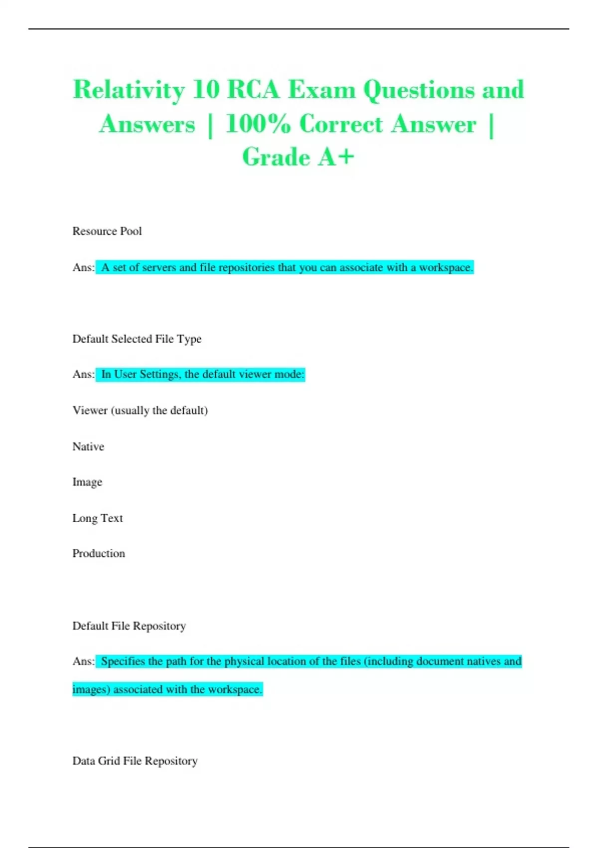 Resource Pool Ans: A set of servers and file repositories that you can associate with a workspace. Default Selected File Type Ans: In User Settings, the default viewer mode: Viewer (usually the default) Native Image Long Text Production Default File Repository Ans: Specifies the path for the physical location of the files (including document natives and images) associated with the workspace. Data Grid File Repository Ans: Specifies the path for the physical location of the text files used by Data Grid. If no file repository is specified for this field, and Data Grid is enabled, Data Grid stores text in the default file repository. Default Cache Location Ans: Specifies the UNC (Universal Naming Convention) path for the network drive where the natives, images, productions, and other file types used by the viewer are temporarily stored. Database Location Ans: The SQL Server where the workspace database is stored. Enable Data Grid Ans: Determines whether or not the workspace can have fields that save to Data Grid. This field appears on the Workspace Details page after you create your workspace