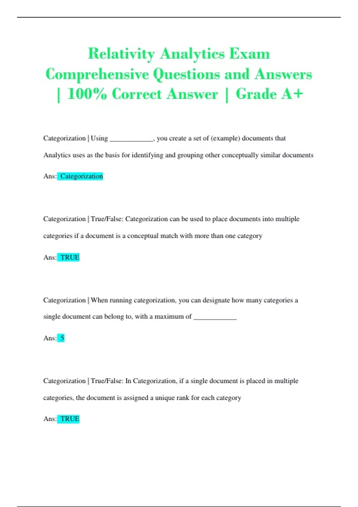 Categorization | Using ____________, you create a set of (example) documents that Analytics uses as the basis for identifying and grouping other conceptually similar documents Ans: Categorization Categorization | True/False: Categorization can be used to place documents into multiple categories if a document is a conceptual match with more than one category Ans: TRUE Categorization | When running categorization, you can designate how many categories a single document can belong to, with a maximum of ____________ Ans: 5 Categorization | True/False: In Categorization, if a single document is placed in multiple categories, the document is assigned a unique rank for each category Ans: TRUE Categorization | List four conditions when Categorization is most effective for classifying documents Ans: (1) You've identified categories or issues; (2) you know how you want to title the categories; (3) you have one or more focused examples to represent the conceptual topic for each category; (4) you have one or more large sets of data that you want to categorize rapidly without any user input after setting-up the category scheme Categorization | ____________ are documents that define the concepts that characterize a category Ans: Example Document