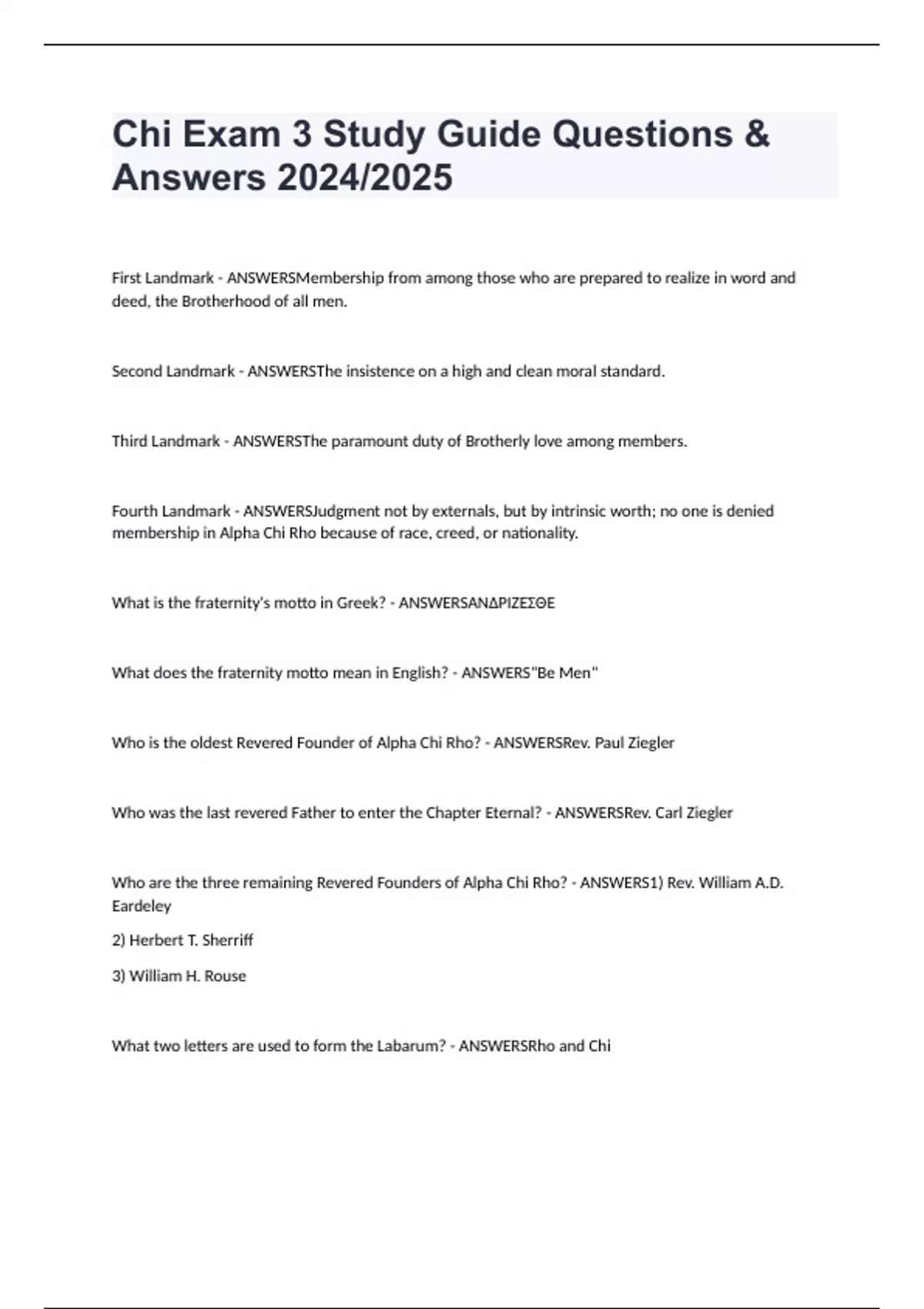 Chi Exam 3 Study Guide Questions & Answers 2024/2025 First Landmark - ANSWERSMembership from among those who are prepared to realize in word and deed, the Brotherhood of all men. Second Landmark - ANSWERSThe insistence on a high and clean moral standard. Third Landmark - ANSWERSThe paramount duty of Brotherly love among members. Fourth Landmark - ANSWERSJudgment not by externals, but by intrinsic worth; no one is denied membership in Alpha Chi Rho because of race, creed, or nationality. What is the fraternity's motto in Greek? - ANSWERSΑΝΔΡΙΖΕΣΘΕ What does the fraternity motto mean in English? - ANSWERS"Be Men" Who is the oldest Revered Founder of Alpha Chi Rho? - ANSWERSRev. Paul Ziegler Who was the last revered Father to enter the Chapter Eternal? - ANSWERSRev. Carl Ziegler Who are the three remaining Revered Founders of Alpha Chi Rho? - ANSWERS1) Rev. William A.D. Eardeley 2) Herbert T. Sherriff 3) William H. Rouse What two letters are used to form the Labarum? - ANSWERSRho and Chi