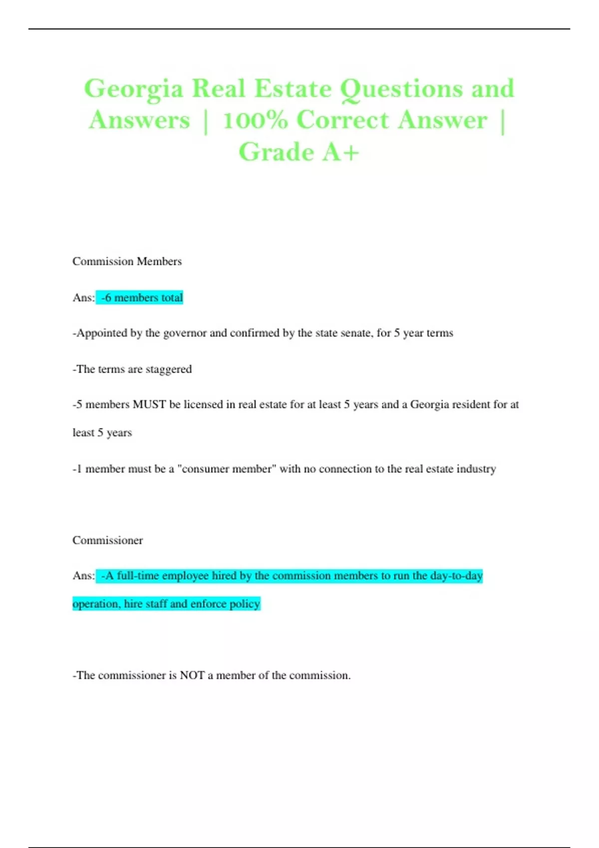 Commission Members Ans: -6 members total -Appointed by the governor and confirmed by the state senate, for 5 year terms -The terms are staggered -5 members MUST be licensed in real estate for at least 5 years and a Georgia resident for at least 5 years -1 member must be a "consumer member" with no connection to the real estate industry Commissioner Ans: -A full-time employee hired by the commission members to run the day-to-day operation, hire staff and enforce policy -The commissioner is NOT a member of the commission. -No employee of the commission (including the commissioner) can hold an active real estate licensee Purpose of the Commission Ans: To protect the public from dishonest and incompetent real estate licensees. Sales & Community Association Managers (CAM) Ans: -At least 18 years old -At Georgia resident, unless applying for a non-resident license -A high school graduate, or hold a certificate of equivalency -Be of good and honest character/ not a convicted felon May request a "Preliminary decision" Sales & CAM application process Ans: -Complete required pre-license educatio