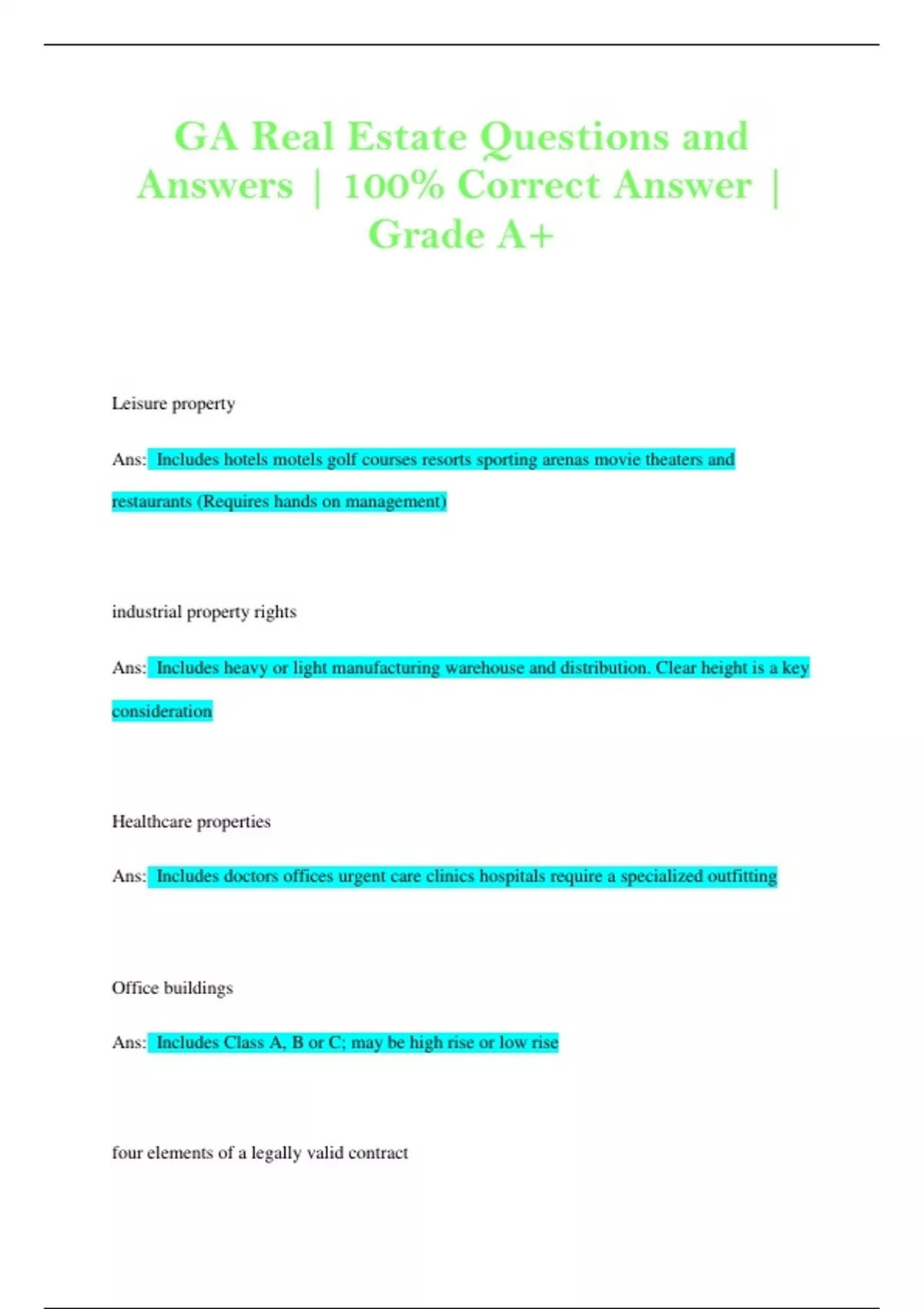 Leisure property Ans: Includes hotels motels golf courses resorts sporting arenas movie theaters and restaurants (Requires hands on management) industrial property rights Ans: Includes heavy or light manufacturing warehouse and distribution. Clear height is a key consideration Healthcare properties Ans: Includes doctors offices urgent care clinics hospitals require a specialized outfitting Office buildings Ans: Includes Class A, B or C; may be high rise or low rise four elements of a legally valid contract Ans: 1. Competent parties 2. Mutual agreement (offer and acceptance) 3. Lawful objective 4. Consideration Statute of Frauds Ans: Dictates that all contracts must be in writin