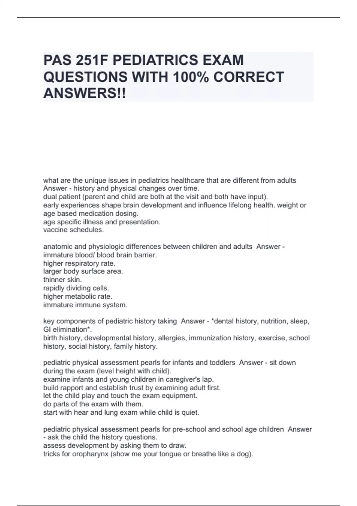 pas 251f pediatrics exam questions with 100 corre