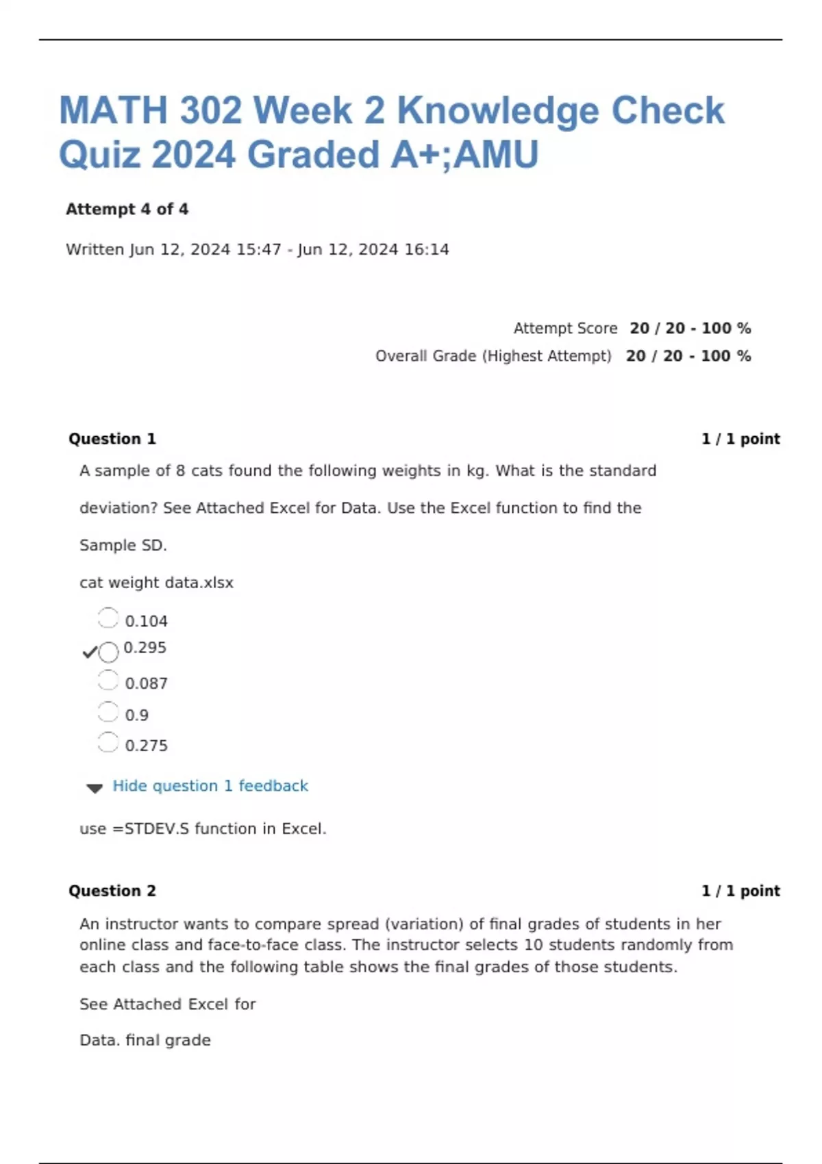 math 302 week 2 knowledge check quiz 2024 graded a