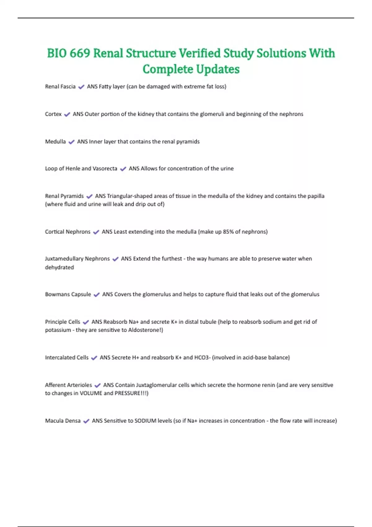 BIO 669 Renal Structure Verified Study Solutions With Complete Updates
