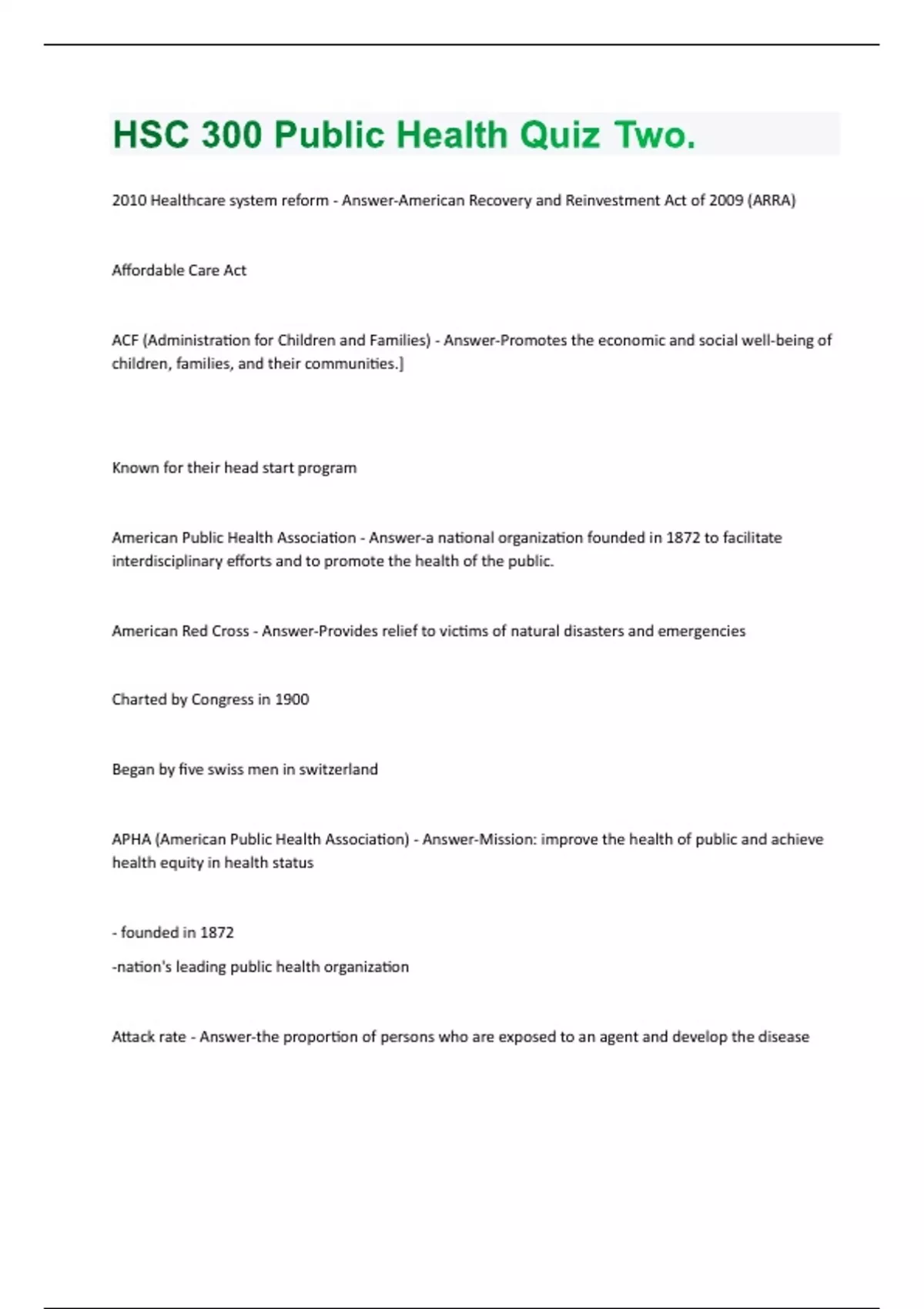 2010 Healthcare system reform - Answer-American Recovery and Reinvestment Act of 2009 (ARRA) Affordable Care Act ACF (Administration for Children and Families) - Answer-Promotes the economic and social well-being of children, families, and their communities.] Known for their head start program American Public Health Association - Answer-a national organization founded in 1872 to facilitate interdisciplinary efforts and to promote the health of the public. American Red Cross - Answer-Provides relief to victims of natural disasters and emergencies Charted by Congress in 1900 Began by five swiss men in switzerland APHA (American Public Health Association) - Answer-Mission: improve the health of public and achieve health equity in health status - founded in 1872 -nation's leading public health organization Attack rate - Answer-the proportion of persons who are exposed to an agent and develop the diseaseCenter for Medicare and Medicaid Services (CMS) - Answer-Establsihed in 1977 as the Health care financing administration Created in1965 to ensure that certain groups were not deprived of healthcare Department of Health and Human Services - Answer-Works for the well-being and health of all Americans Formed in 1960- by President Jimmy Carter Largest department in the federal system EPA - Answer-an independent federal agency established to coordinate programs aimed at reducing pollution and protecting the environment Government health agencies - Answer-Health agencies that are part of the governmental structure (Federal, state, or local) primarily funded by tax dollars How many core functions of public health? - Answer-10