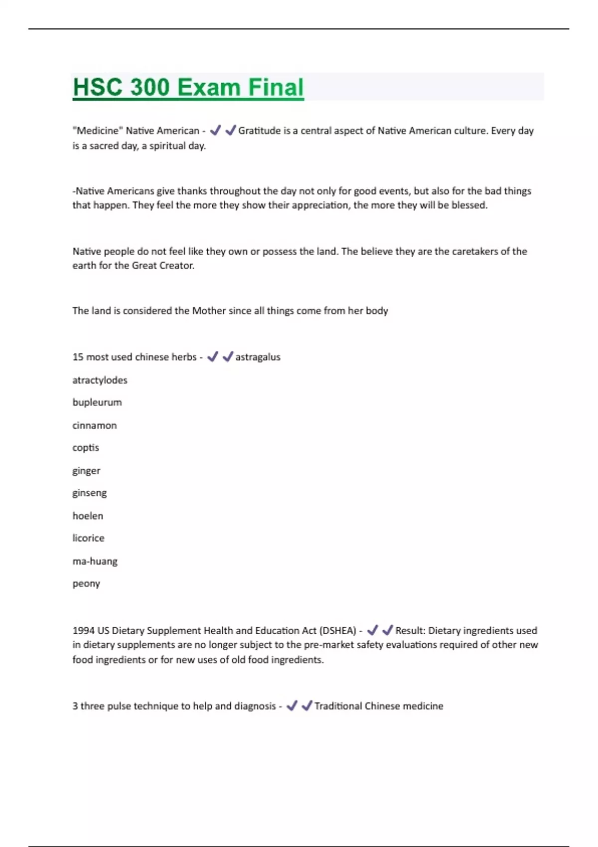 "Medicine" Native American - Gratitude is a central aspect of Native American culture. Every day is a sacred day, a spiritual day. -Native Americans give thanks throughout the day not only for good events, but also for the bad things that happen. They feel the more they show their appreciation, the more they will be blessed. Native people do not feel like they own or possess the land. The believe they are the caretakers of the earth for the Great Creator. The land is considered the Mother since all things come from her body 15 most used chinese herbs - astragalus atractylodes bupleurum cinnamon coptis ginger ginseng hoelen licorice ma-huang peony 1994 US Dietary Supplement Health and Education Act (DSHEA) - Result: Dietary ingredients used in dietary supplements are no longer subject to the pre-market safety evaluations required of other new food ingredients or for new uses of old food ingredients. 3 three pulse technique to help and diagnosis - Traditional Chinese medicine