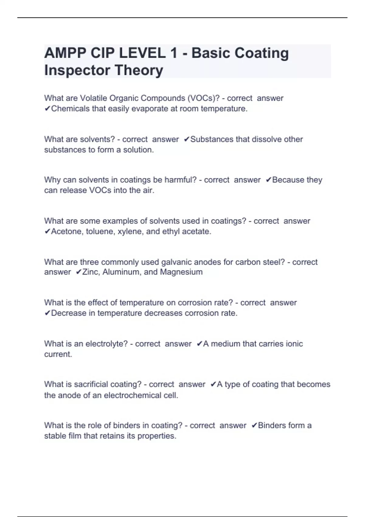 AMPP CIP LEVEL 1 Question and answers already passed AMPP CIP LEVEL 1 - Basic Coating Inspector Theory What are Volatile Organic Compounds (VOCs)? - correct answer Chemicals that easily evaporate at room temperature. What are solvents? - correct answer Substances that dissolve other substances to form a solution. Why can solvents in coatings be harmful? - correct answer Because they can release VOCs into the air. What are some examples of solvents used in coatings? - correct answer Acetone, toluene, xylene, and ethyl acetate. What are three commonly used galvanic anodes for carbon steel? - correct answer Zinc, Aluminum, and Magnesium What is the effect of temperature on corrosion rate? - correct answer Decrease in temperature decreases corrosion rate. What is an electrolyte? -