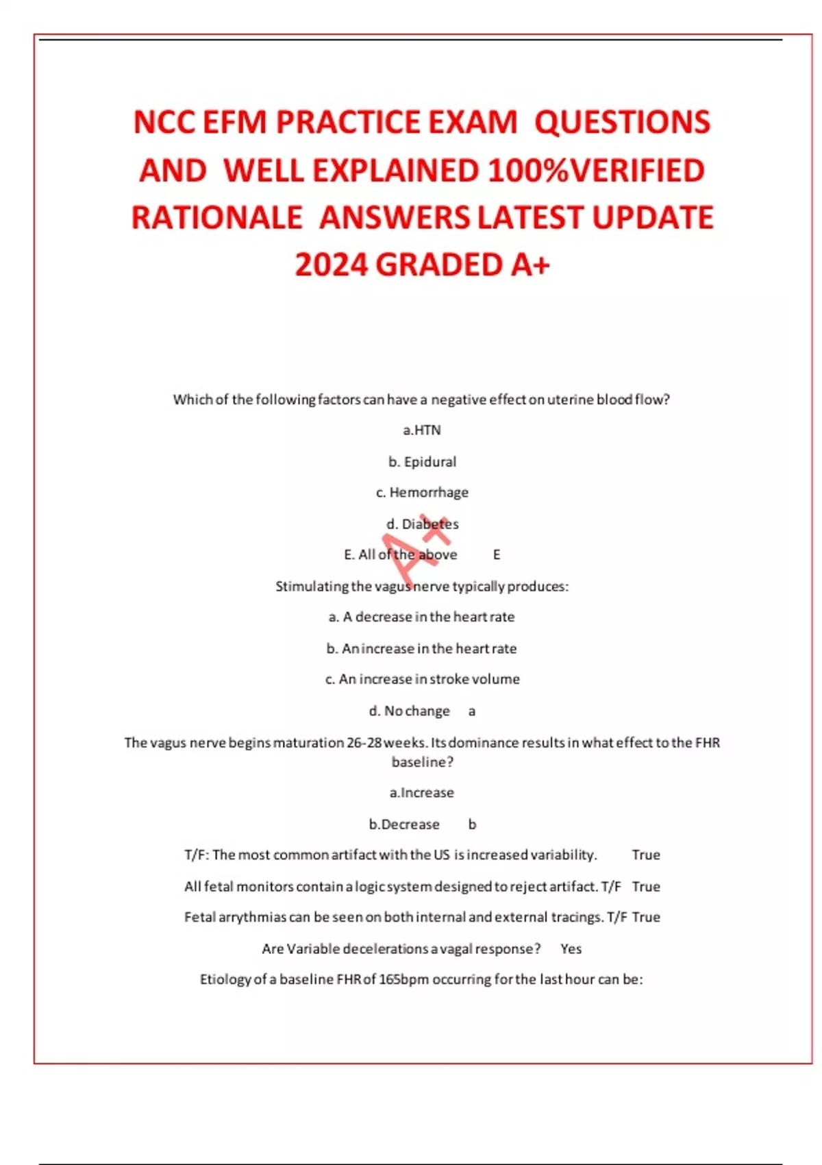 NCC EFM PRACTICE EXAM QUESTIONS AND WELL EXPLAINED 100%VERIFIED RATIONALE ANSWERS LATEST UPDATE 2024 GRADED A+ Which of the following factors can have a negative effect on uterine blood flow? a.HTN b. Epidural c. Hemorrhage d. Diabetes E. All of the above E Stimulating the vagus nerve typically produces: a. A decrease in the heart rate b. An increase in the heart rate c. An increase in stroke volume d. No change a The vagus nerve begins maturation 26-28 weeks. Its dominance results in what effect to the FHR baseline? a.Increase b.Decrease b T/F: The most common artifact with the US is increased variability. True All fetal monitors contain a logic system designed to reject artifact. T/F True Fetal arrythmias can be seen on both internal and external tracings. T/F True Are Variable decelerations a vagal response? Yes Etiology of a baseline FHR of 165bpm occurring for the last hour can be: 1. Maternal supine hypotension 2. Maternal fever 3. Maternal dehydration 4. Unknown a. 1 and 2 b. 1, 2 and 3 c. 2, 3 and 4 c The most prevalent risk factos associated with fetal death before onset of labor is: a. low socioeconomic status b. fetal malpresentation c. Uteroplacental insufficiency c Respiratory