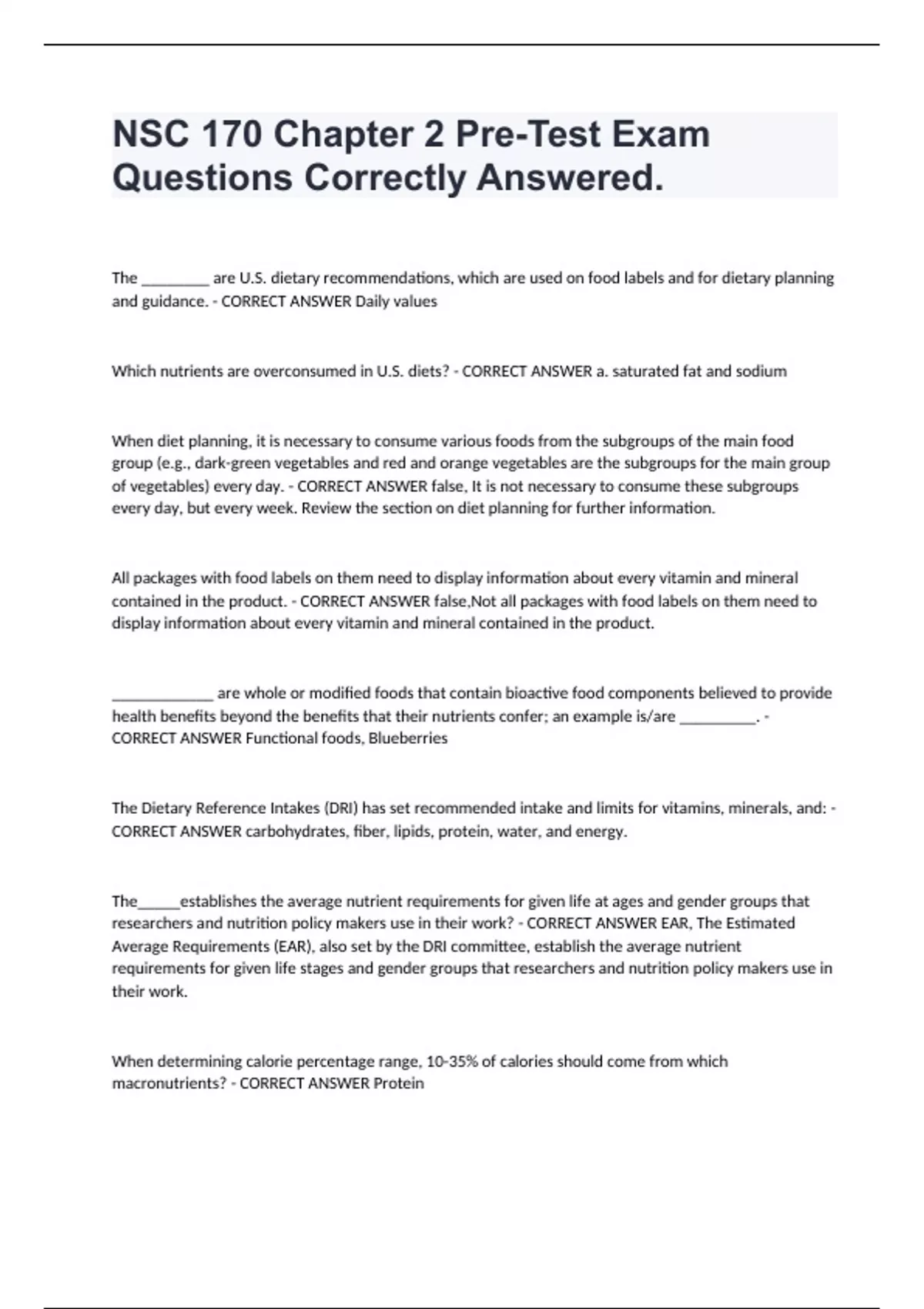 NSC 170 Chapter 2 Pre-Test Exam Questions Correctly Answered. The ________ are U.S. dietary recommendations, which are used on food labels and for dietary planning and guidance. - CORRECT ANSWER Daily values Which nutrients are overconsumed in U.S. diets? - CORRECT ANSWER a. saturated fat and sodium When diet planning, it is necessary to consume various foods from the subgroups of the main food group (e.g., dark-green vegetables and red and orange vegetables are the subgroups for the main group of vegetables) every day. - CORRECT ANSWER false, It is not necessary to consume these subgroups every day, but every week. Review the section on diet planning for further information. All packages with food labels on them need to display information about every vitamin and mineral contained in the product. - CORRECT ANSWER false,Not all packages with food labels on them need to display information about every vitamin and mineral contained in the product. ____________ are whole or modified foods that contain bioactive food components believed to provide health benefits beyond the benefits that their nutrients confer; an example is/are _________. - CORRECT ANSWER Functional foods, Blueberries The Dietary Reference Intakes (DRI) has set recommended intake and limits for vitamins, minerals, and: - CORRECT ANSWER carbohydrates, fiber, lipids, protein, water, and energy. The_____establishes the average nutrient requirements for given life at ages and gender groups that researchers and nutrition policy makers use in their work? - CORRECT ANSWER EAR, The Estimated Average Requirements (EAR), also set by the DRI committee, establish the average nutrient requirements for given life stages and gender groups that researchers and nutrition policy makers use in their work. When determining calorie percentage range, 10-35% of calories should come from which macronutrients? - CORRECT ANSWER Protein