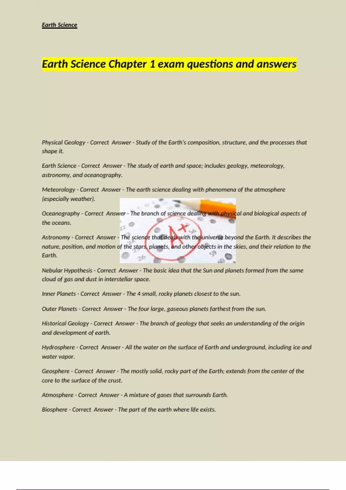 PACKAGE FOR EARTH SCIENCE EXAM WITH COMPLETE SOLUTION GUARANTEED SUCCESS!!!