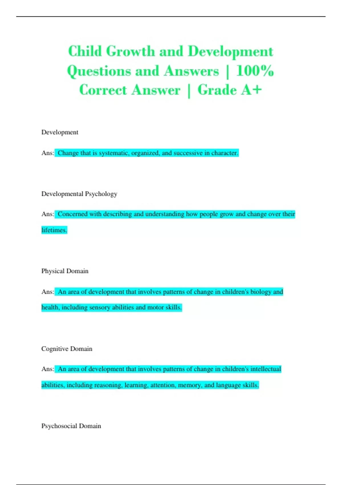 Child Growth and Development Questions and Answers | 100% Correct Answer | Grade A+