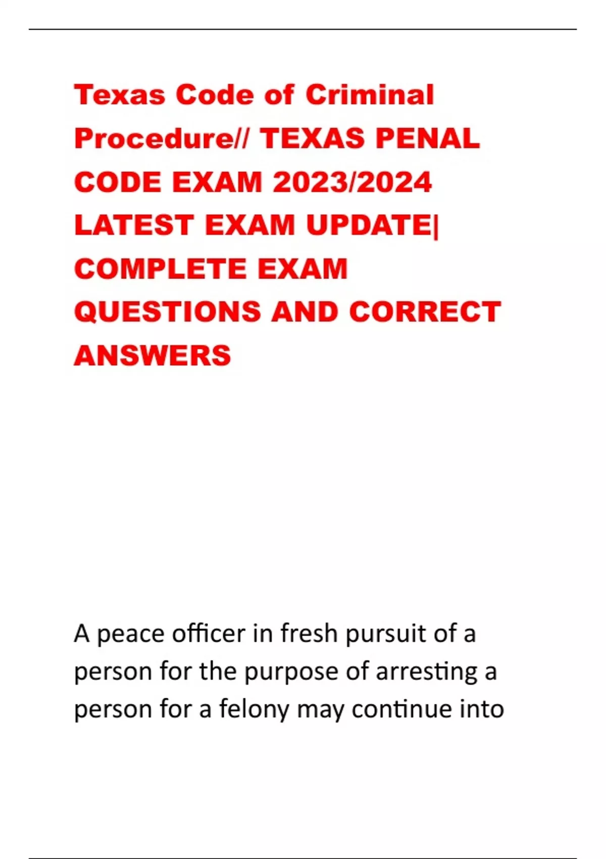Texas Code of Criminal Procedure// TEXAS PENAL CODE EXAM 2023/2024 LATEST EXAM UPDATE| COMPLETE EXAM QUESTIONS AND CORRECT ANSWERS