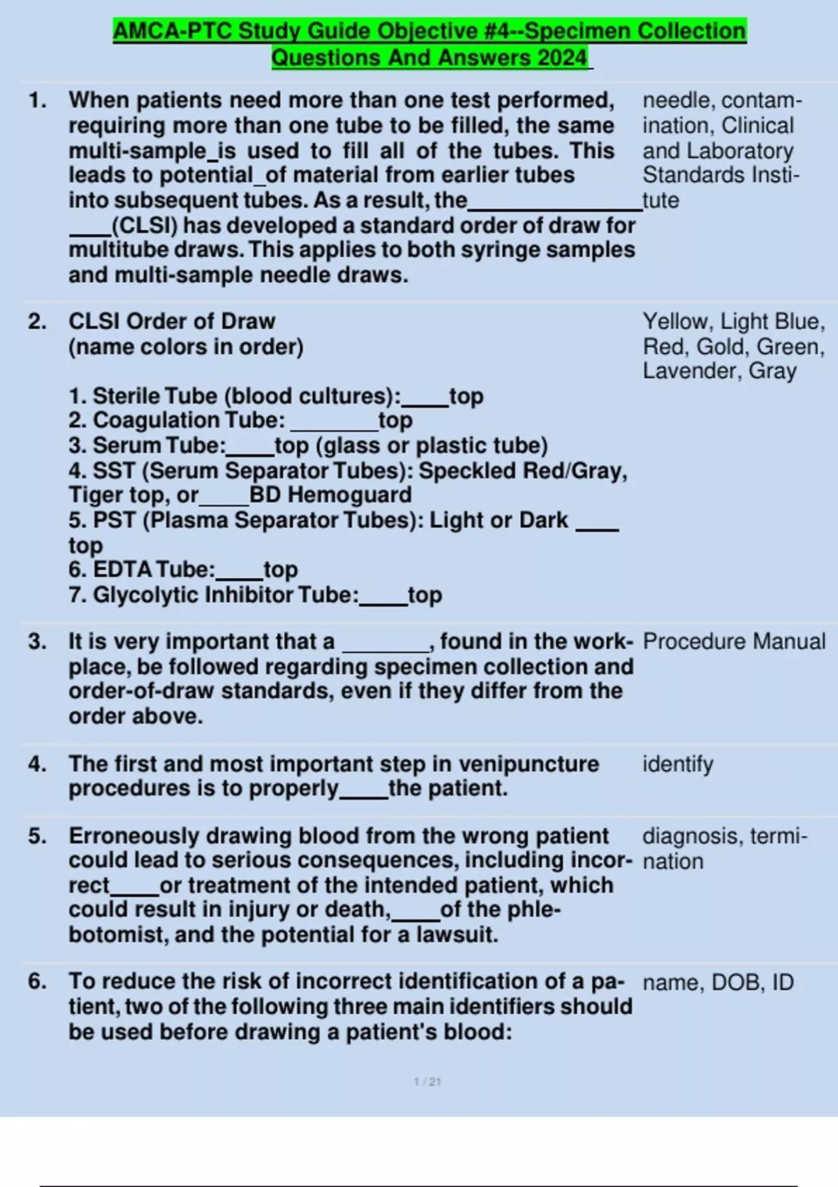 AMCA-PTC Study Guide Objective #4--Specimen Collection Questions And Answers 2024