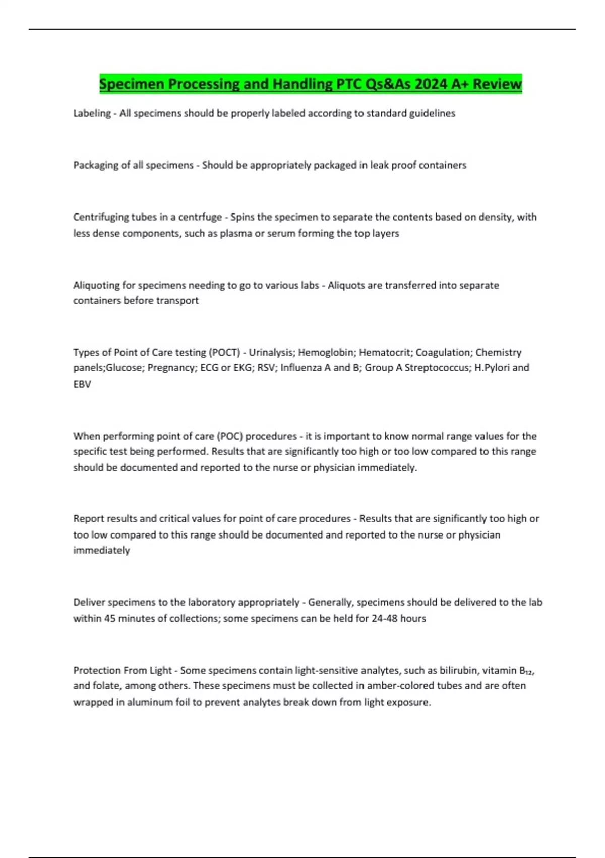 Specimen Processing and Handling PTC Qs&As 2024 A+ Review Labeling - All specimens should be properly labeled according to standard guidelines Packaging of all specimens - Should be appropriately packaged in leak proof containers Centrifuging tubes in a centrfuge - Spins the specimen to separate the contents based on density, with less dense components, such as plasma or serum forming the top layers Aliquoting for specimens needing to go to various labs - Aliquots are transferred into separate containers before transport Types of Point of Care testing (POCT) - Urinalysis; Hemoglobin; Hematocrit; Coagulation; Chemistry panels;Glucose; Pregnancy; ECG or EKG; RSV; Influenza A and B; Group A Streptococcus; H.Pylori and EBV When performing point of care (POC) procedures - it is important to know normal range values for the specific test being performed. Results that are significantly too high or too low compared to this range should be documented and reported to the nurse or physician immediately. Report results and critical values for point of care procedures - Results that are significantly too high or too low compared to this range should be documented and reported to the nurse or physician immediately Deliver specimens to the laboratory appropriately - Generally, specimens should be delivered to the lab within 45 minutes of collections; some specimens can be held for 24-48 hours Protection From Light - Some specimens contain light-sensitive analytes, such as bilirubin, vitamin B₁₂, and folate, among others. These specimens must be collected in amber-colored tubes and are often wrapped in aluminum foil to prevent analytes break down from light exposure.
