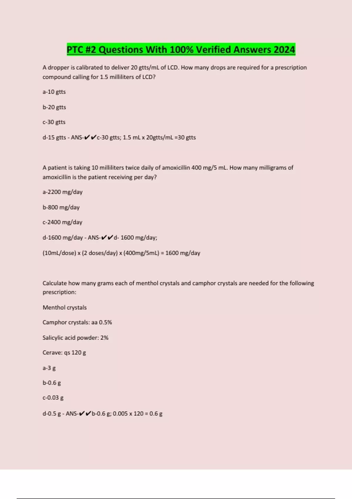PTC #2 Questions With 100% Verified Answers 2024 A dropper is calibrated to deliver 20 gtts/mL of LCD. How many drops are required for a prescription compound calling for 1.5 milliliters of LCD? a-10 gtts b-20 gtts c-30 gtts d-15 gtts - ANS-c-30 gtts; 1.5 mL x 20gtts/mL =30 gtts A patient is taking 10 milliliters twice daily of amoxicillin 400 mg/5 mL. How many milligrams of amoxicillin is the patient receiving per day? a-2200 mg/day b-800 mg/day c-2400 mg/day d-1600 mg/day - ANS-d- 1600 mg/day; (10mL/dose) x (2 doses/day) x (400mg/5mL) = 1600 mg/day Calculate how many grams each of menthol crystals and camphor crystals are needed for the following prescription: Menthol crystals Camphor crystals: aa 0.5% Salicylic acid powder: 2% Cerave: qs 120 g a-3 g b-0.6 g c-0.03 g d-0.5 g - ANS...