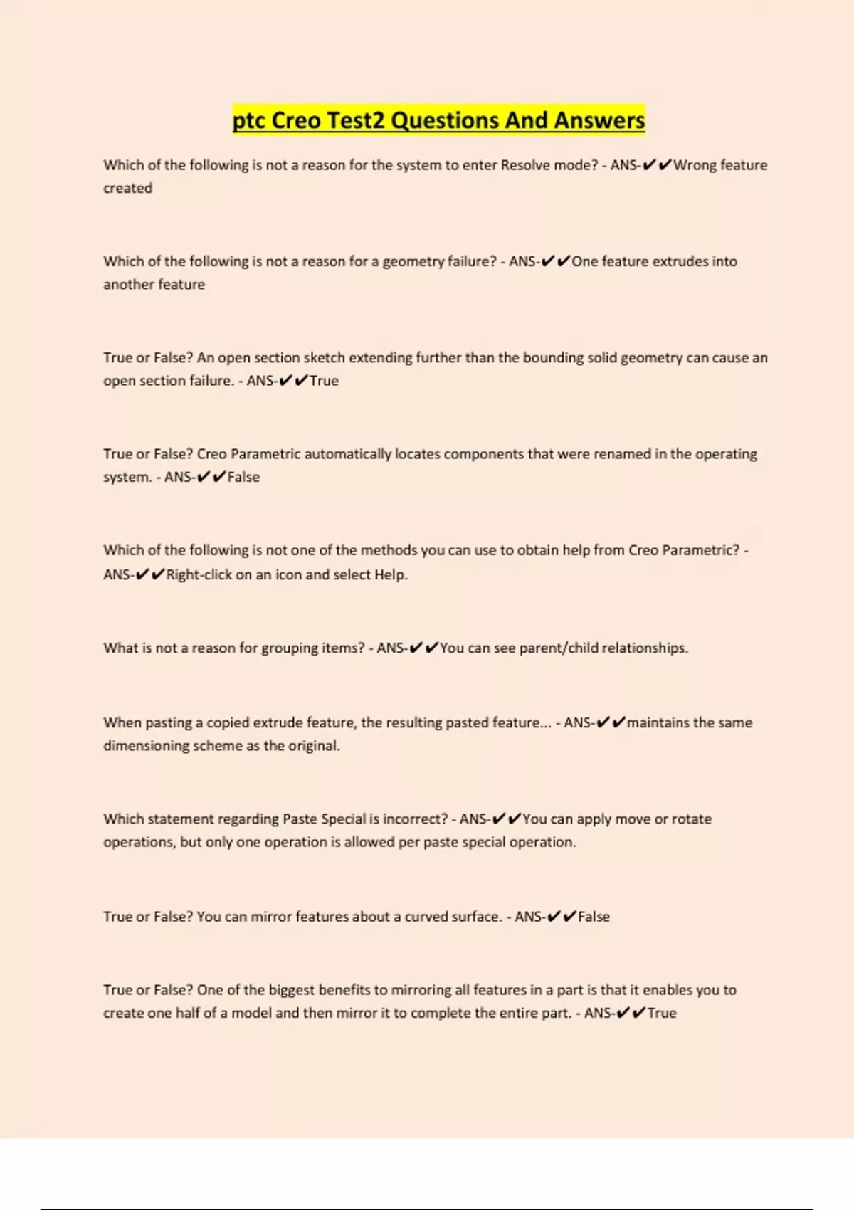 ptc Creo Test2 Questions And Answers Which of the following is not a reason for the system to enter Resolve mode? - ANS-Wrong feature created Which of the following is not a reason for a geometry failure? - ANS-One feature extrudes into another feature True or False? An open section sketch extending further than the bounding solid geometry can cause an open section failure. - ANS-True True or False? Creo Parametric automatically locates components that were renamed in the operating system. - ANS-False Which of the following is not one of the methods you can use to obtain help from Creo Parametric? - ANS-Right-click on an icon and select Help. What is not a reason for grouping items?...