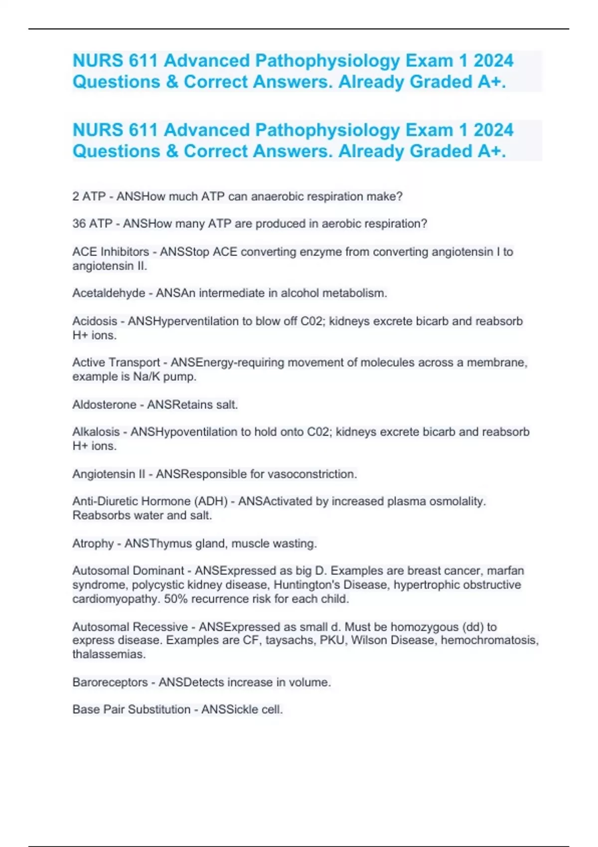 NURS 611 Advanced Pathophysiology Exam 1 2024 Questions & Correct Answers. Already Graded A+.