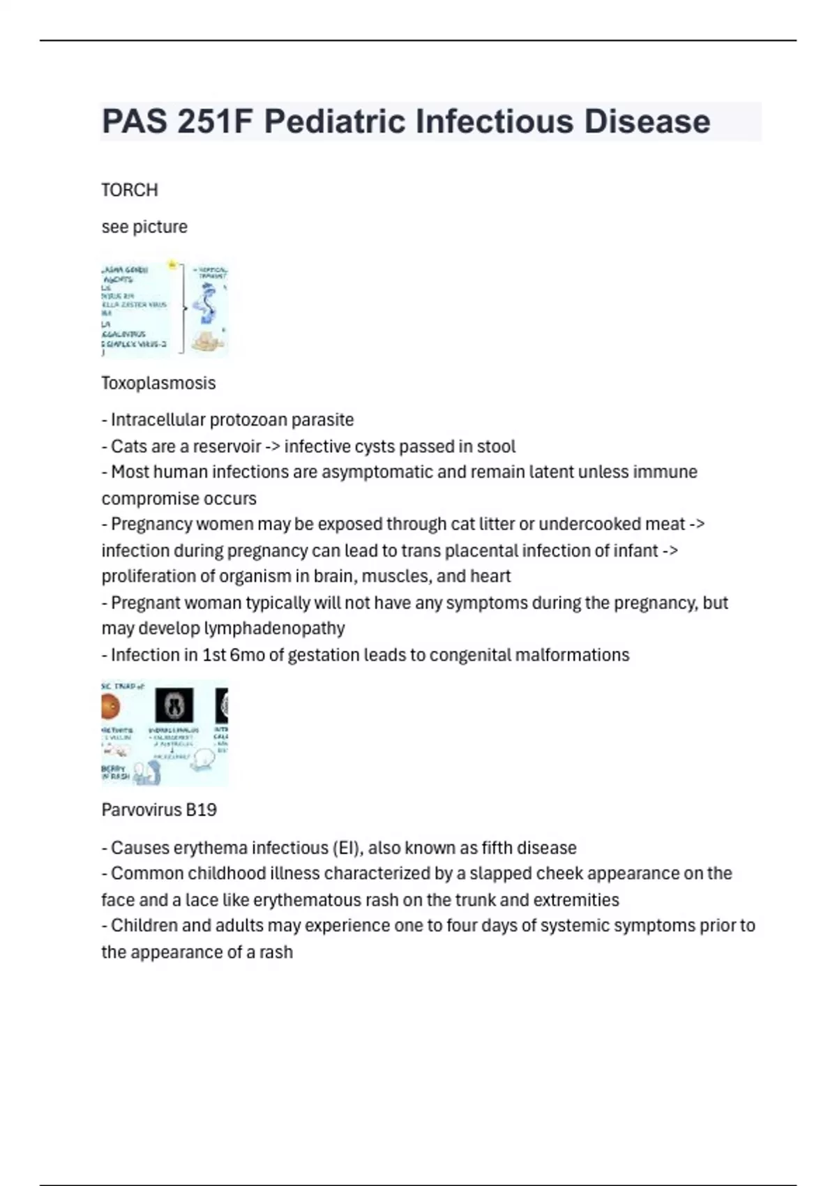 TORCH see picture Toxoplasmosis - Intracellular protozoan parasite - Cats are a reservoir -> infective cysts passed in stool - Most human infections are asymptomatic and remain latent unless immune compromise occurs - Pregnancy women may be exposed through cat litter or undercooked meat -> infection during pregnancy can lead to trans placental infection of infant -> proliferation of organism in brain, muscles, and heart - Pregnant woman typically will not have any symptoms during the pregnancy, but may develop lymphadenopathy - Infection in 1st 6mo of gestation leads to congenital malformations Parvovirus B19 - Causes erythema infectious (EI), also known as fifth disease - Common childhood illness characterized by a slapped cheek appearance on the face and a lace like erythematous rash on the trunk and extremities - Children and adults may experience one to four days of systemic symptoms prior to the appearance of a rash - Arthropathy affecting the joints of the hands, wrists, knees, and ankles may occur (most commonly in adults) and lasts one to two weeks Varicella Zoster Virus - Highly contagious w attack rate of 90% of exposed unvaccinated adults - Onset up to 14d after exposure w prodrome of fever, malaise, pharyngitis, and loss of appetite - Successive crops of pruritic vesicles - Self limiting in healthy children - High risk groups can be treated w antivirals - Rare complications include skin and soft tissue infections, encephalitis, pneumonia, and hepatitis - Vaccine contraindicated during pregnancy (live virus)