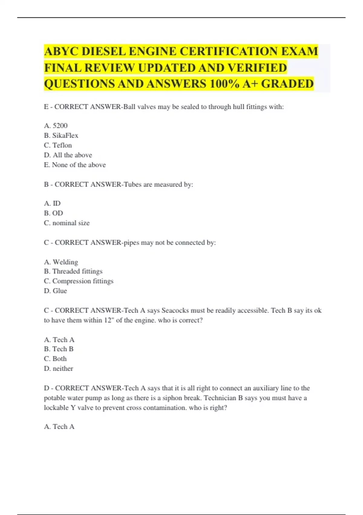 ABYC DIESEL ENGINE CERTIFICATION EXAM FINAL REVIEW UPDATED AND VERIFIED QUESTIONS AND ANSWERS 100% A+ GRADED E - CORRECT ANSWER-Ball valves may be sealed to through hull fittings with: A. 5200 B. SikaFlex C. Teflon D. All the above E. None of the above B - CORRECT ANSWER-Tubes are measured by: A. ID B. OD C. nominal size C - CORRECT ANSWER-pipes may not be connected by: A. Welding B. Threaded fittings C. Compression fittings D. Glue C - CORRECT ANSWER-Tech A says Seacocks must be readily accessible. Tech B say its ok to have them within 12" of the engine. who is correct? A. Tech A B. Tech B C. Both D. neither D - CORRECT ANSWER-Tech A says that it is all right to connect an auxiliary line to the potable water pump as long as there is a siphon break. Technician B says you must have a lockable Y valve to prevent cross contamination. who is right? A. Tech A B. Tech B C. Both D. Neither D - CORRECT ANSWER-A bildge pump discharge line must be: A. equipped with a check valve to prevent back flow and nuisance cycling B. Equipped with a properly installed seacock C. No more than 30' long D. non of the above D - CORRECT ANSWER-ball valves below the waterline must be: A. ABYC approved B. ABYC Certified C. ABYC endorsed D. none of the above D - CORRECT ANSWER-potable water systems must discharge A. into a sump B. Overboard C. Into the grey water tank D. any of the above OD ID - CORRECT ANSWER-Tubes are measured in _________ and hoses are measured in _________ A - CORRECT ANSWER-Which of the following components may need to be by-passed for the purpose of decommissioning? A. Tanks, filters and water heaters B. Strainers, tanks and pumps C. Fixtures and lines D. Dockside water connections B - CORRECT ANSWER-Which of the following agencies must be referenced when selecting materials for use in a portable water system? A. DOT B. FDA C. USCG D. UL B - CORRECT ANSWER-According to ABYC, a biologically contaminated potable- water system should be disinfected with a mixture of chlorine and have a strength of at least: A. 1,00ppm B. 100ppm C. 10ppm D. 1 ppm B - CORRECT ANSWER-Contamination of the potable-water system with ethylene glycol may be explained by: A. Excessive pump cycling B. Leaking heat exchanger on a water heater C. Nuisance tripping of pump circuit breaker D. Close proximity of engine to water heater A - CORRECT ANSWER-With a Type 1 sanitation system, waste is: A. Treated and discharged B. Treated and held C. Stored in a holding tank D. Discharged without treatment A - CORRECT ANSWER-A head located below the vessels's dynamic waterline using RAW water for flushing requires a: A. Vented loop on its intake B. Check valve on its intake C. Strainer on its intake D. Check valve on its discharge A - CORRECT ANSWER-The result of an obstructed holding tank even during pump out may be: A. A collapsed holding tank B. Raw water flooding C. An explosion D. Tank contamination